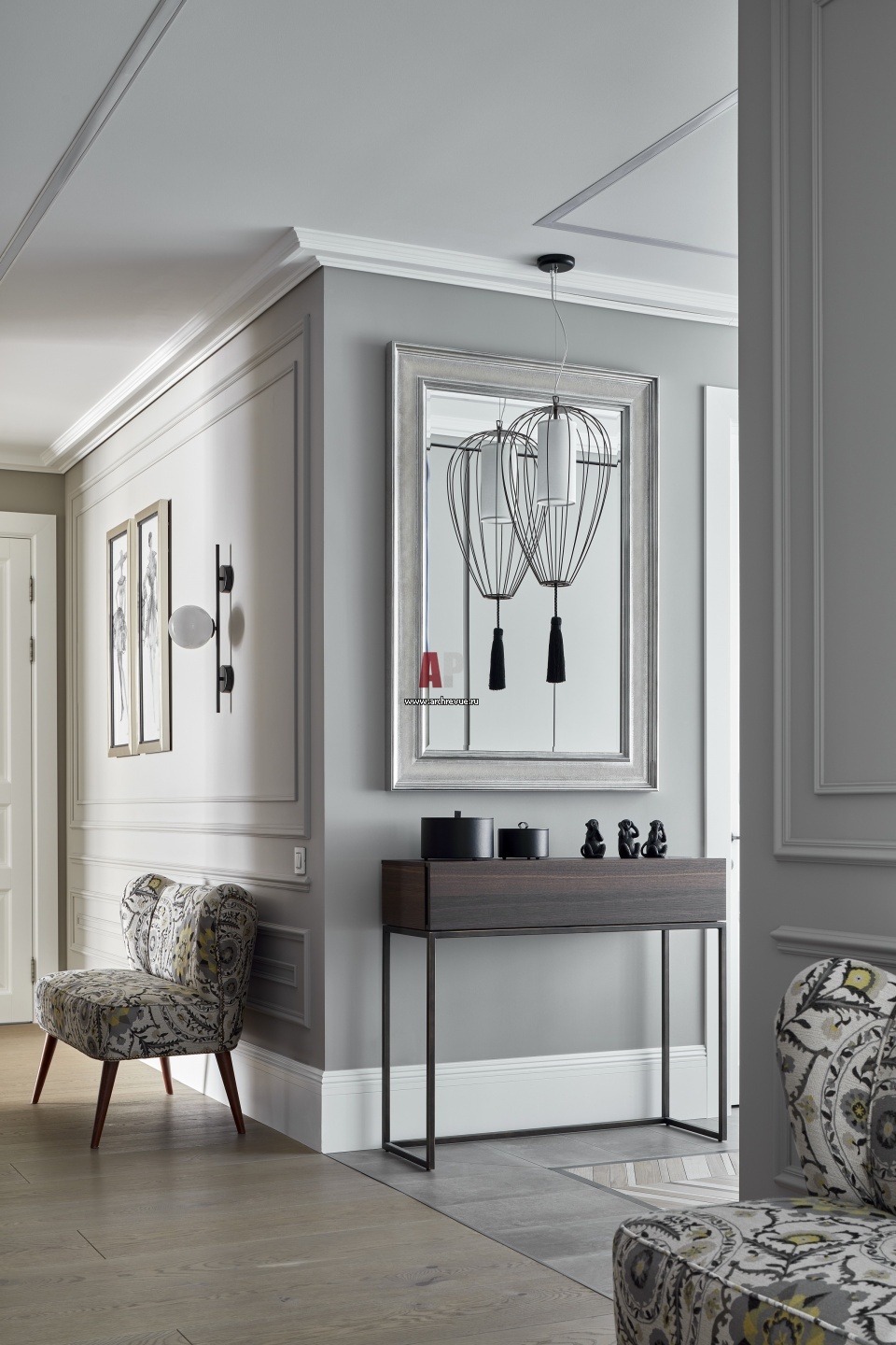 Жилые помещения связывает холл со сквозной гардеробной. Гостиная, спальни и кабинет расходятся от него лучами. Консоль, Bmb Italy. Светильники, Aromas del Campo.