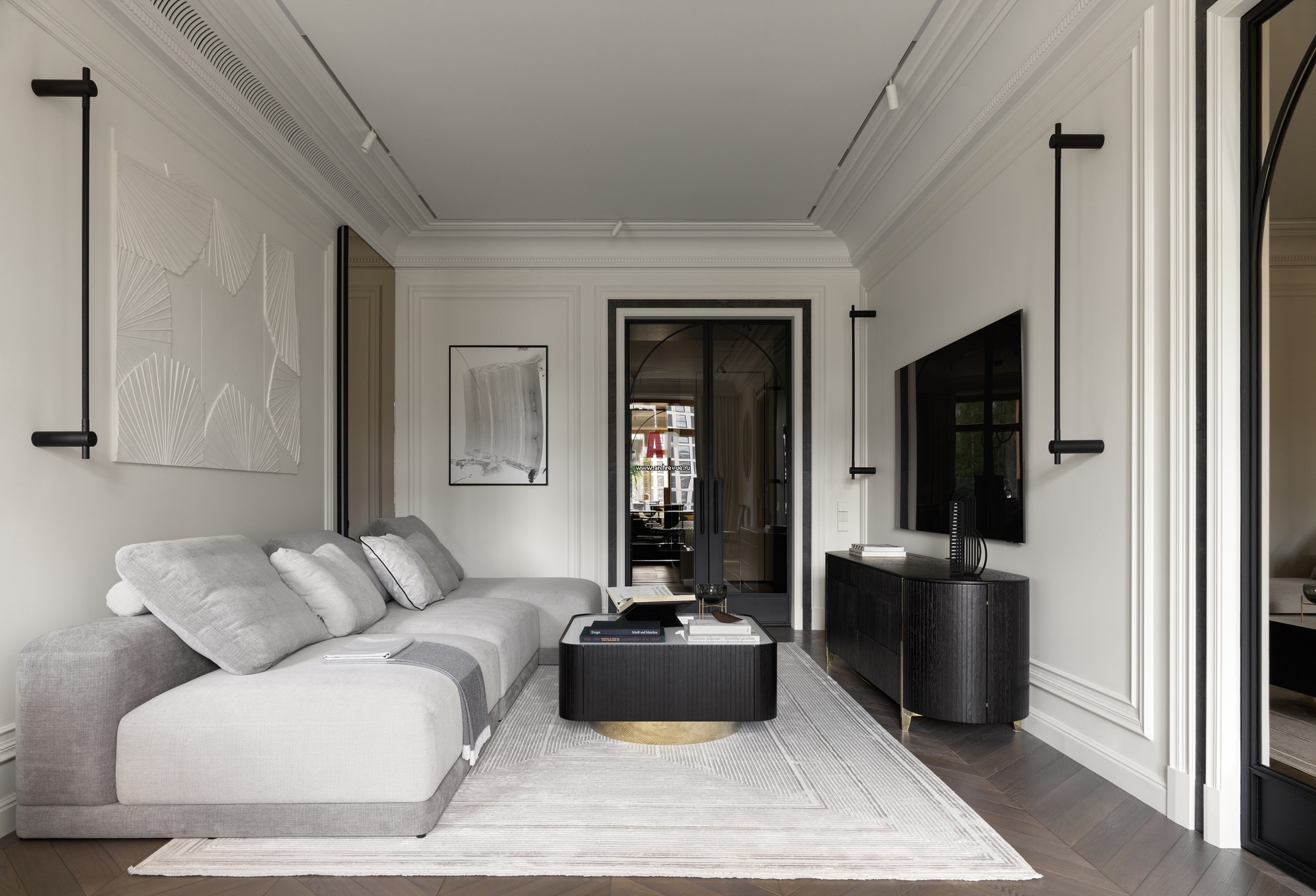 Монохромный интерьер. Диванная группа в гостиной. Арочный дверной портал из тонированного стекла эффектно отделяет коридор. Зеркальные панели с подсветкой усложняют интерьер.
