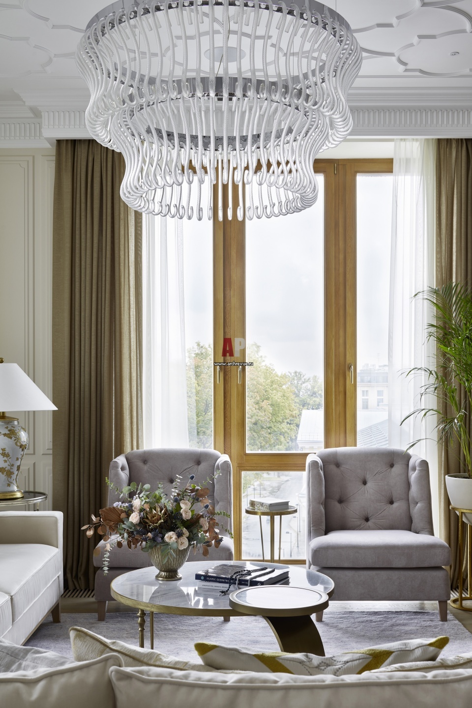 Интерьер гостиной оформлен в стиле традиционных американских интерьеров. Люстра изготовлена на фабрике Barovier & Toso на заказ по индивидуальным размерам.