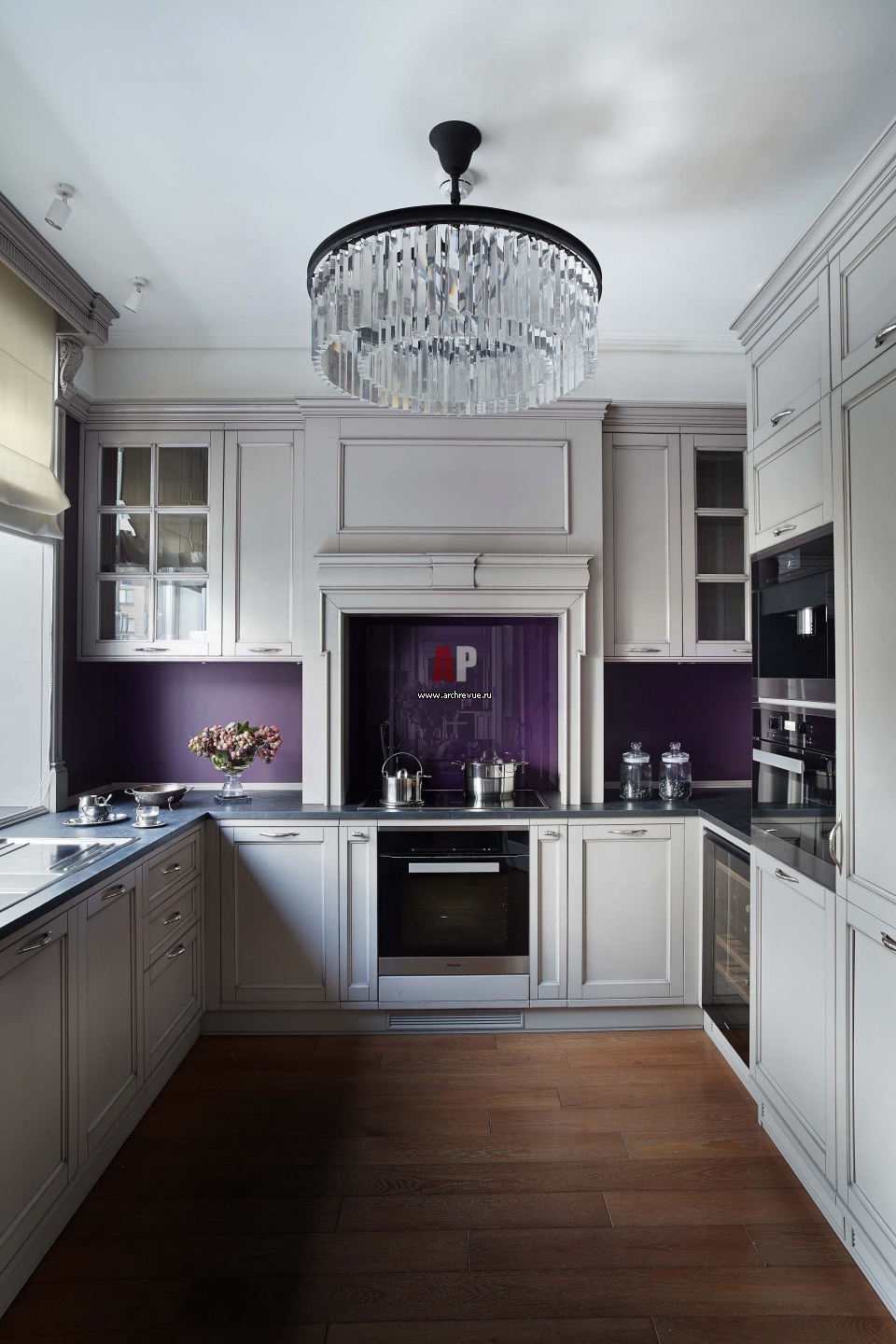 Интерьер кухни с сиреневым фартуком. В зоне варочной панели фартук закрыт прозрачным стеклом. Кухонный гарнитур из светлого дерева с неоклассическим элементами, Luciano Zonta.