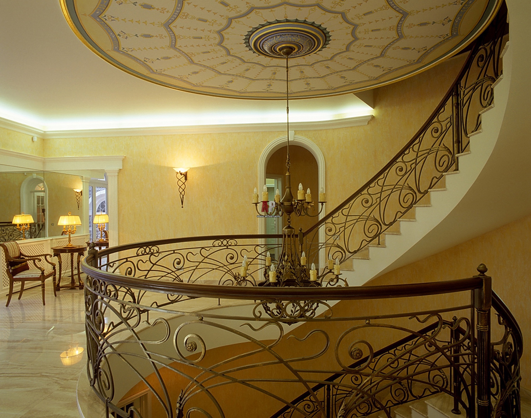 Гостевые зоны решены как открытые светлые помещения. Кованые перила и люстра выполнены по эскизам архитектора.