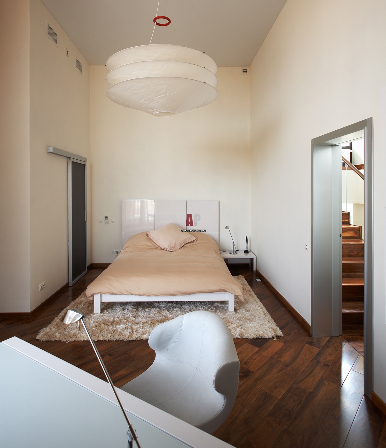 Фото интерьера спальни. Помещения оформлены лаконично: белые покраски, натуральное дерево и стекло – вот основные материалы, которые используют архитекторы.