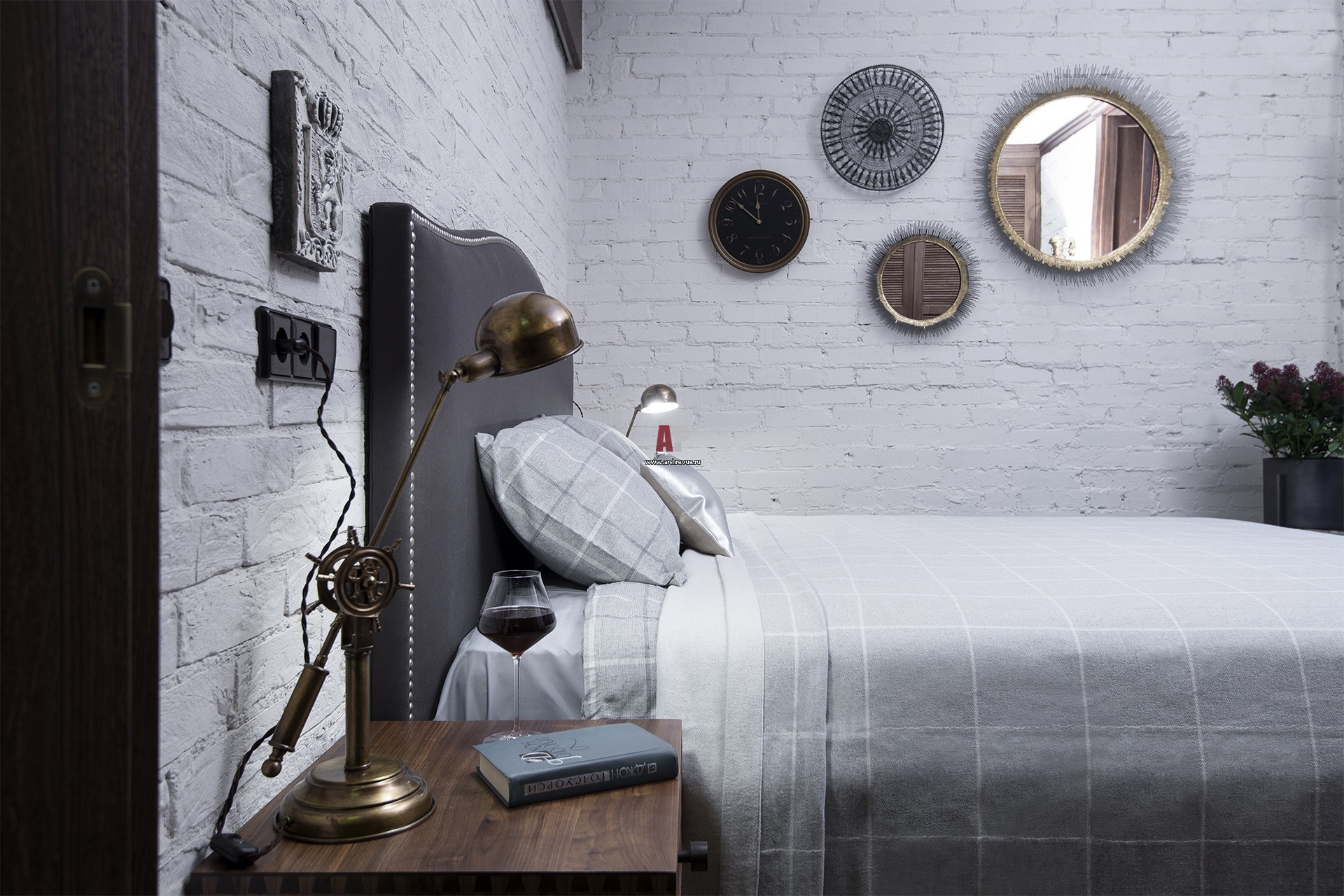 Кирпичные стены в квартире «родные», они были очищены от штукатурки и выкрашены в сложный белый цвет. Кровать, прикроватные тумбочки, зеркала, поставщик Crate and Barrel.