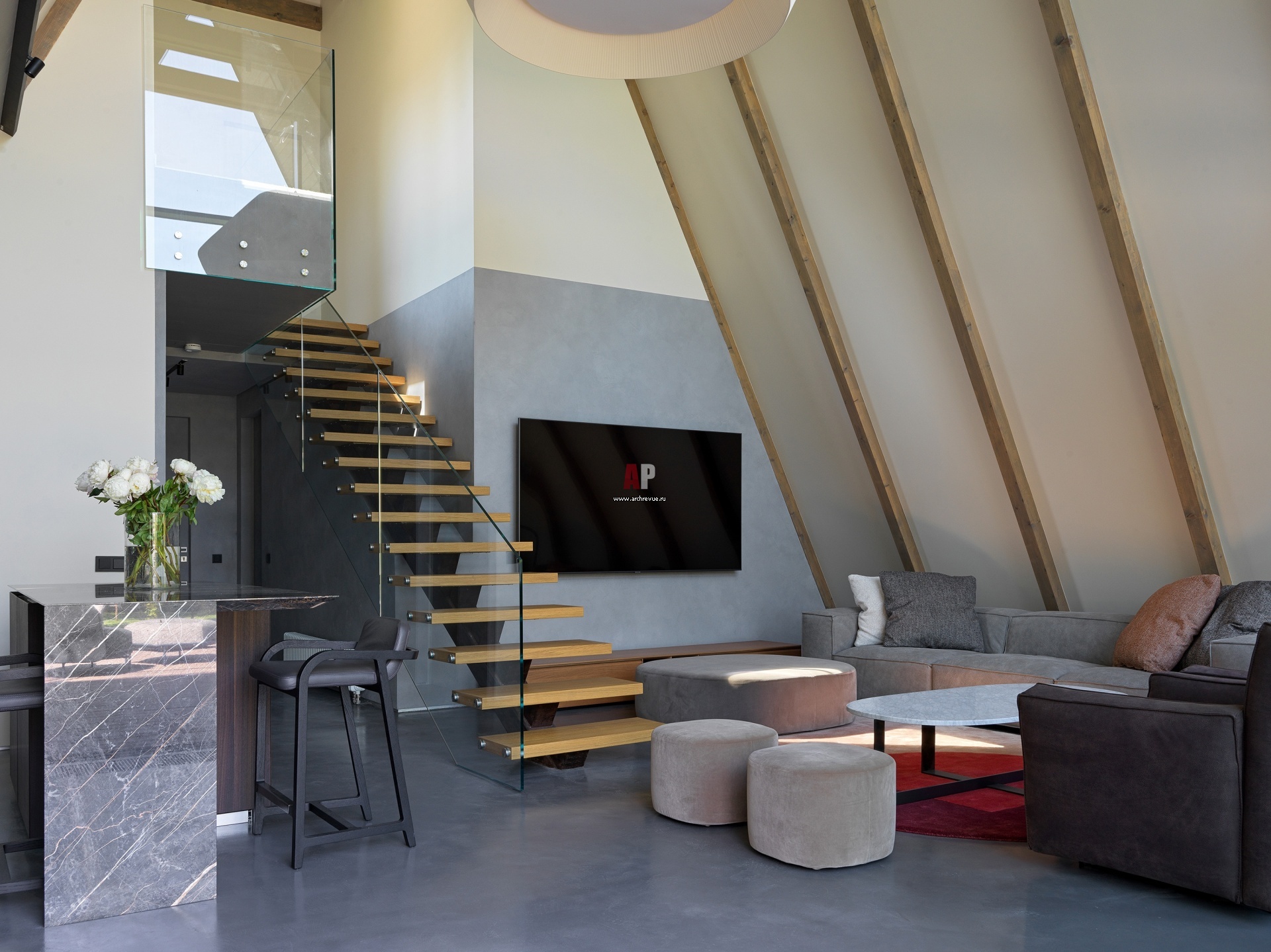 Зону гостиной и кухни разделяет лестница с консольными ступенями. Во время больших посиделок они используются как дополнительные посадочные места.