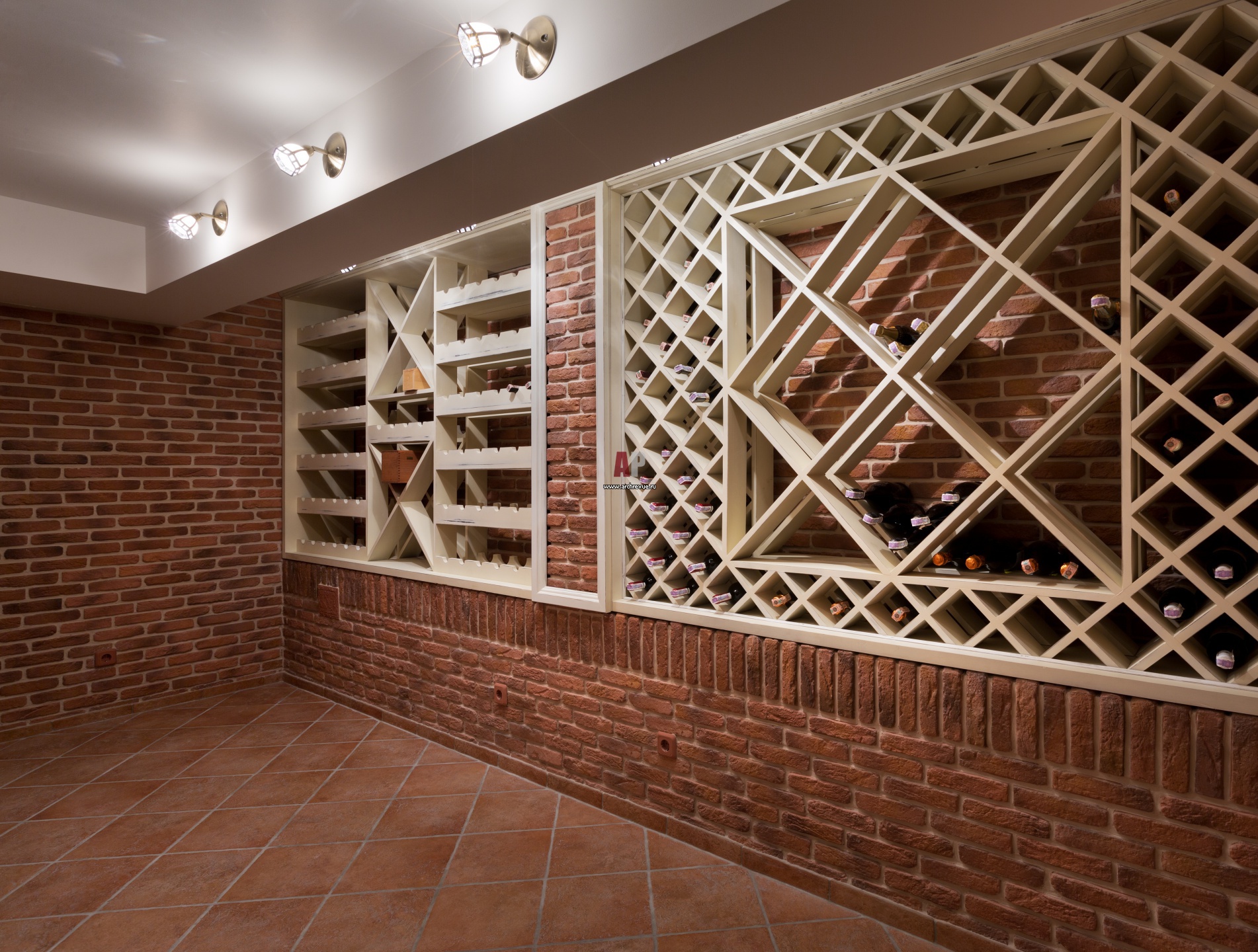 Интерьер винного погреба в дизайне частного загородного дома выполнен в общей стилистике проекта. Стены кирпичные, стеллажи для хранения – дерево, белая эмаль. Лицевой керамический кирпич Terca, Wienerberger.