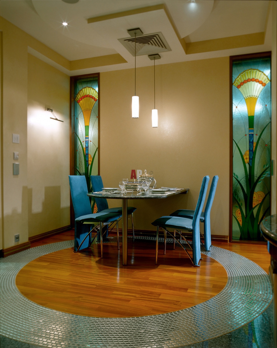 Зона для завтраков на кухне. Кухня изолирована от гостевых помещений перегородкой с витражами.