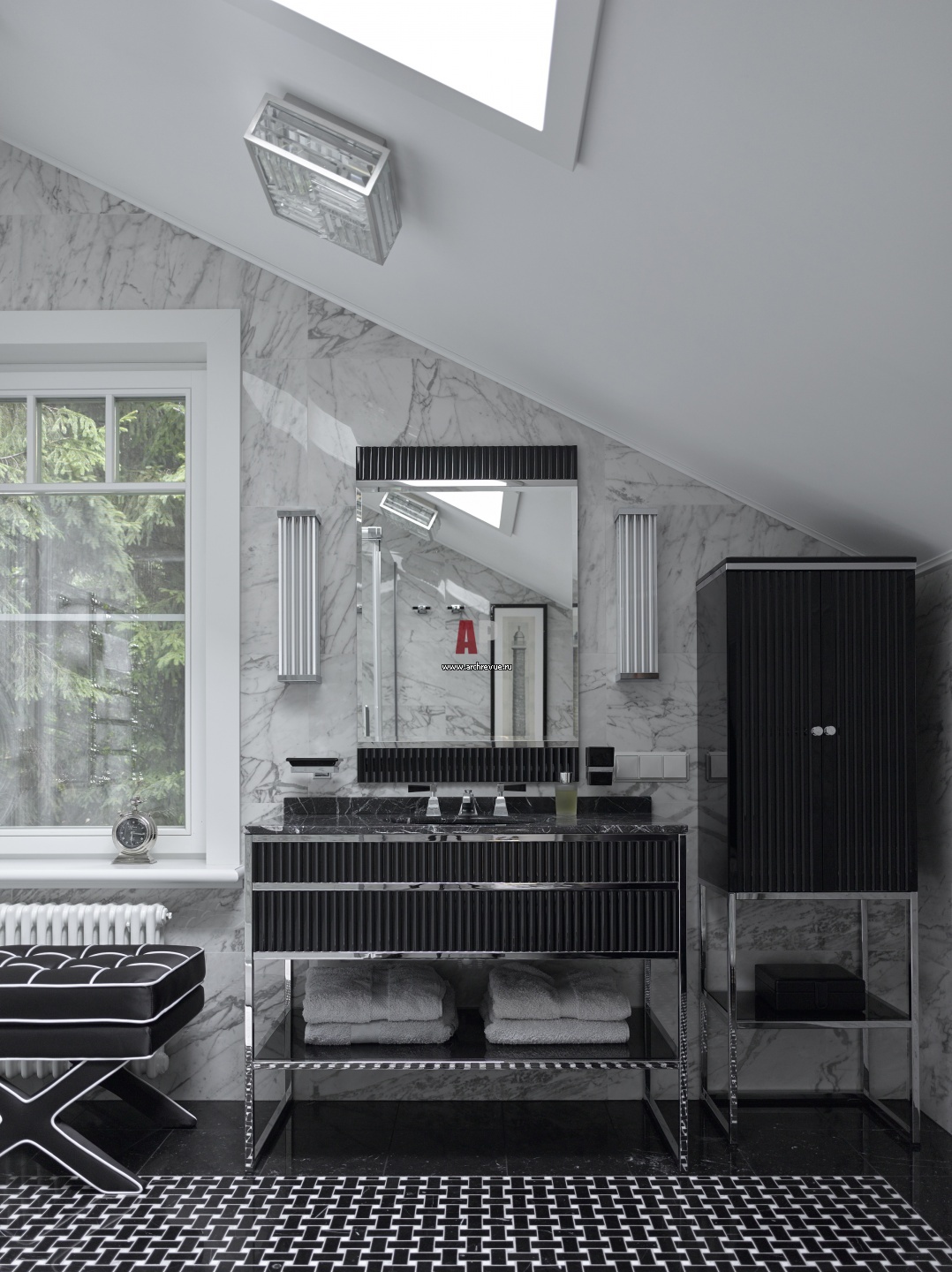 Ванная комната при спальне хозяина выполнена в черно-сером цвете, с серебряными аксессуарами. Умывальник, Oasis. На полу, стенах и столешнице – итальянский мрамор.