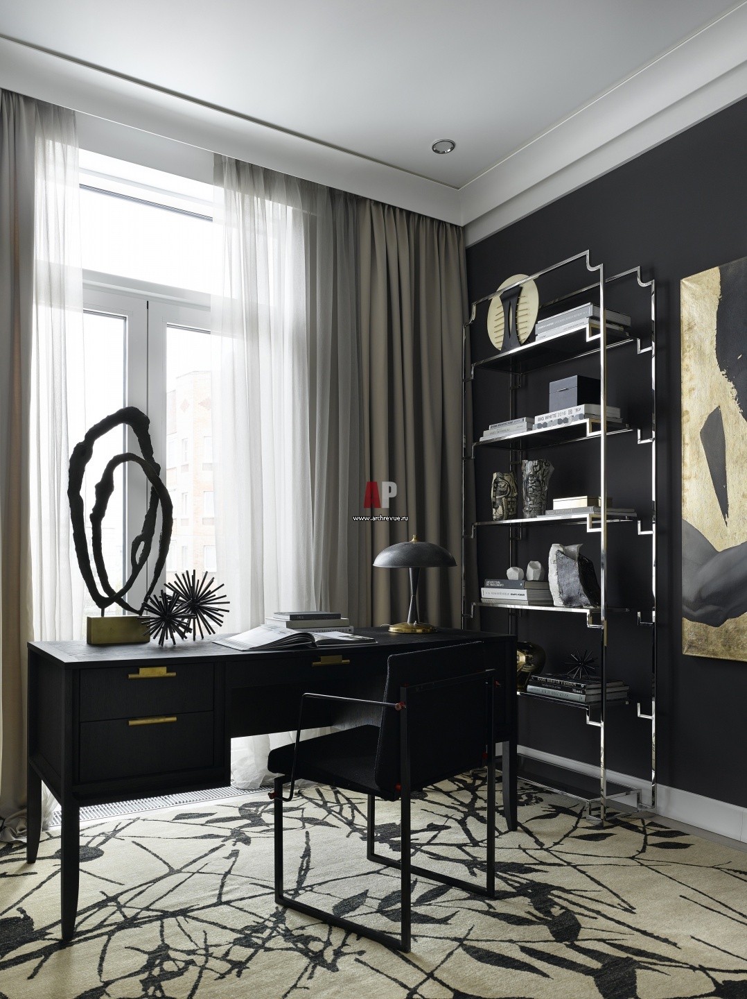 Кабинет хотелось «утеплить» и сделать очень насыщенным, поэтому преобладает черный цвет с золотыми акцентными деталями. Письменный стол, Dantone Home. Стул, настольная лампа, винтаж.