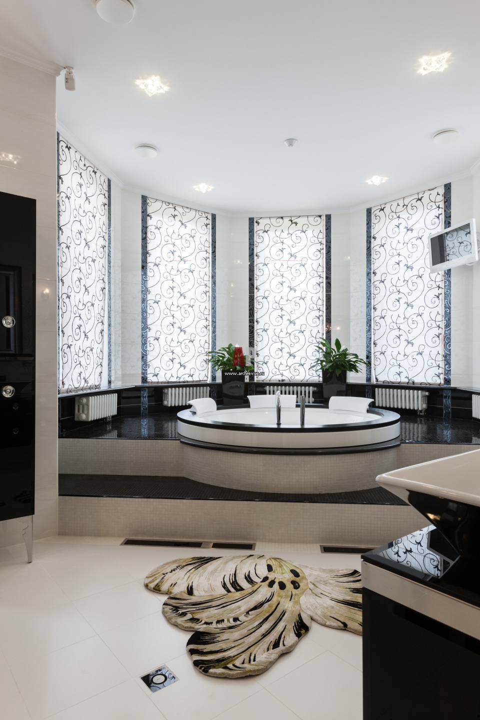 Интерьер хозяйской ванной в стиле ар-деко. Круглая ванна-джакузи вынесена на ступенчатый подиум и размещена возле полукруглого эркера с вертикальными окнами.