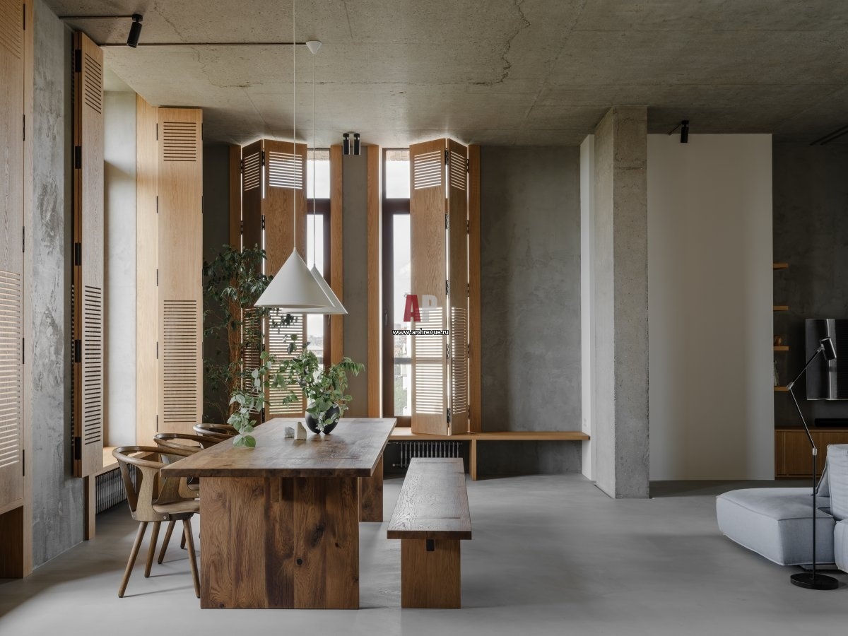 Столовая. Обеденная группа из дерева изготовлена на заказ. Парные светильники, Annular, модель Woud. Деревянные ставни выполнены по эскизам студии.