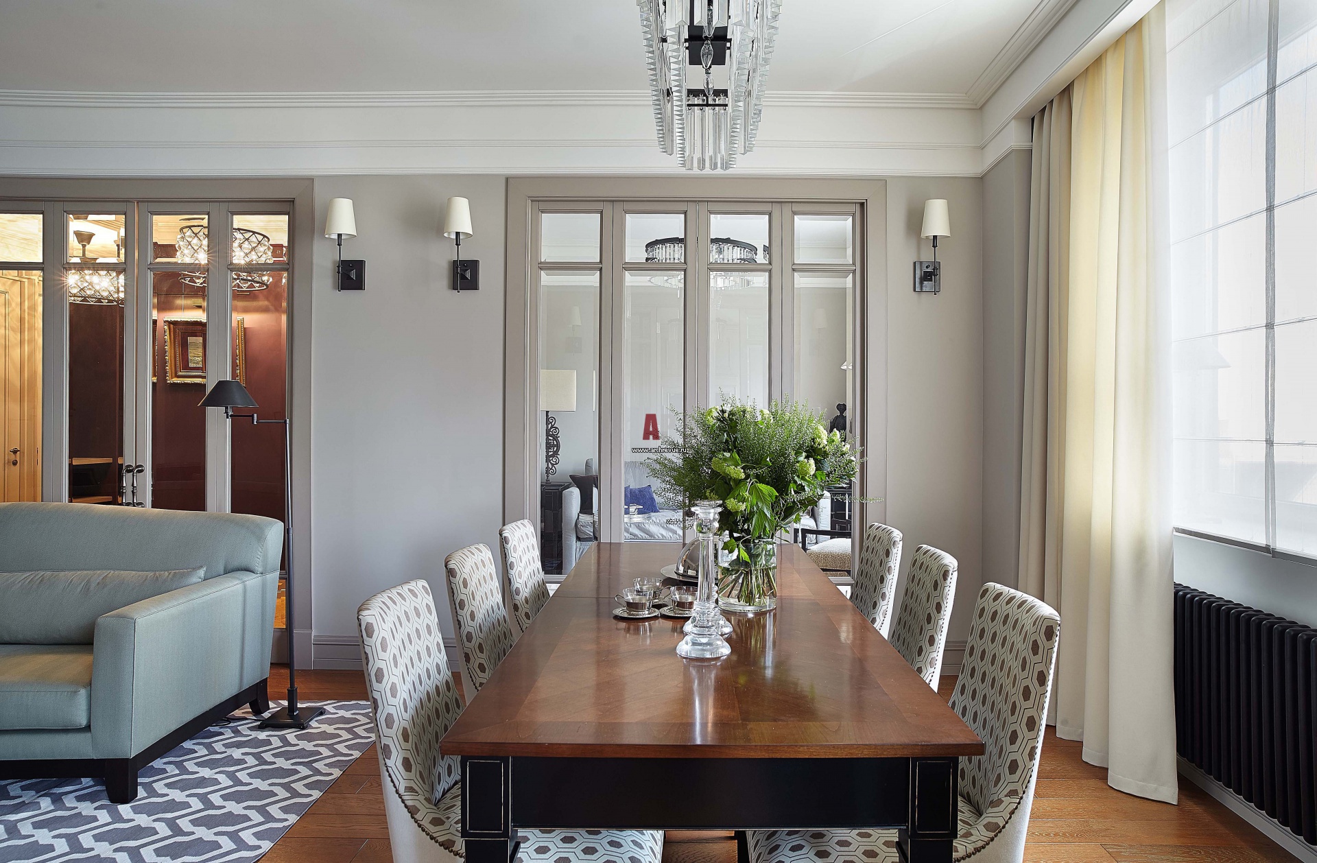 Интерьер столовой в светлой цветовой гамме и американской стилистке. Столовая группа, Arte Brotto, Morelato.