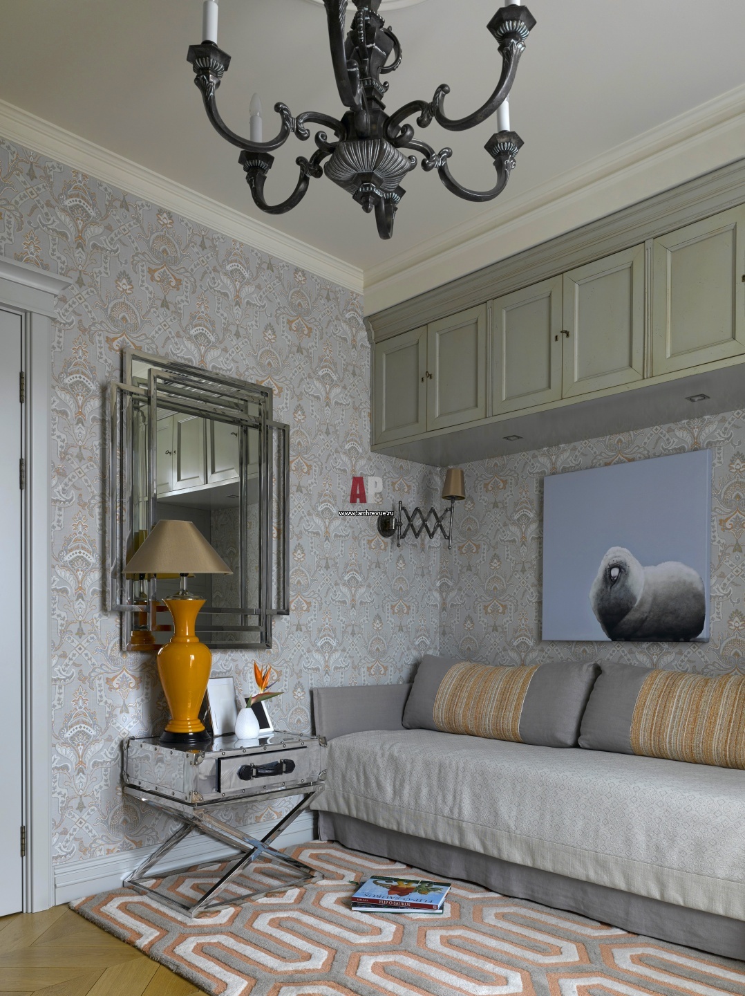 Детская комната. Нейтральную серую гамму усложняют яркие оранжевые акценты в рисунке обоев, ковра, подушек, а также в декоре настольных ламп. Обои, Thibaut. Шкафы, AM Classic. Кровать, Meridiani. Люстра, Visual Comfort & Co.