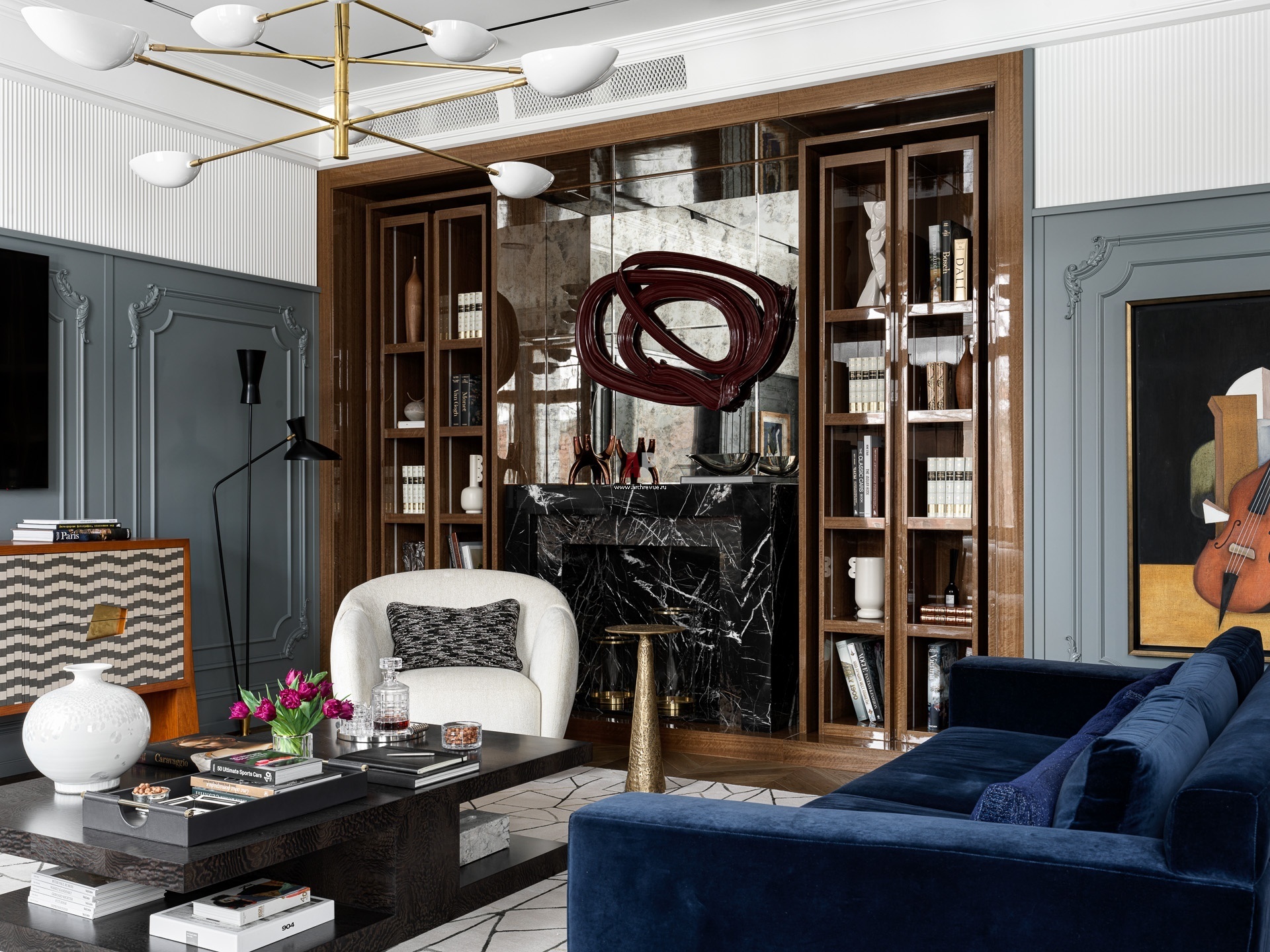 Каминная зона в гостиной. Портал камина изготовлен из натурального камня черного цвета. Над ни – состаренное зеркало. Витрины из экзотического дерева под глянцевым лаком изготовлены на заказ. Скульптура Дмитрия Горбунова.