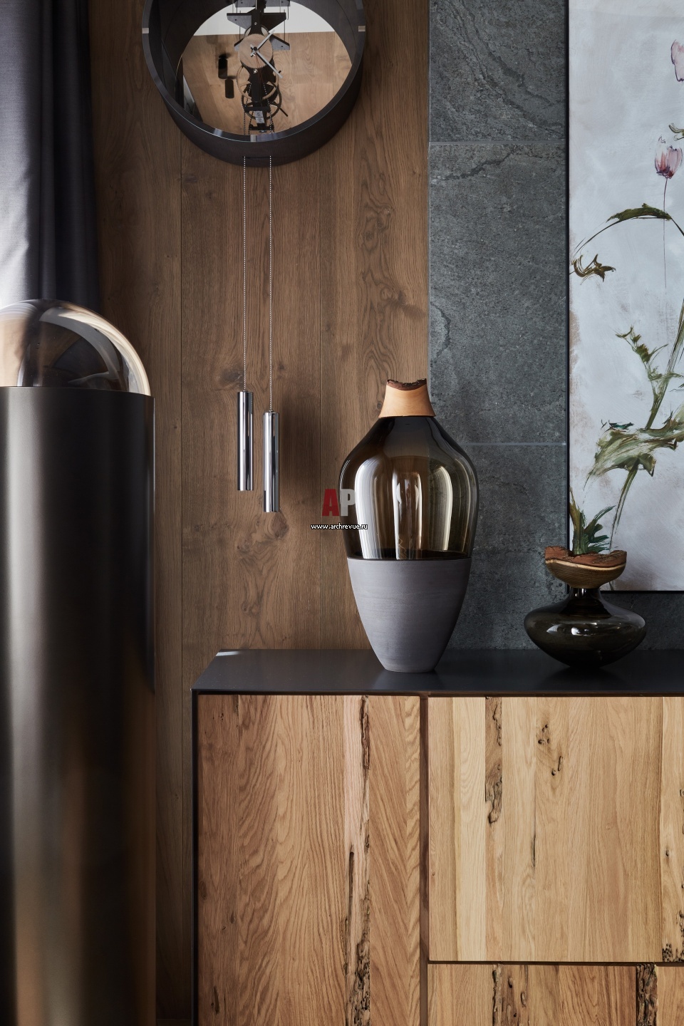Квартира с природными материалами и фактурами. Интерьер спальни. На комоде Riva 1920 – вазы из дерева и стекла, Utopia & Utility. Живопись, Клэр Баслер.