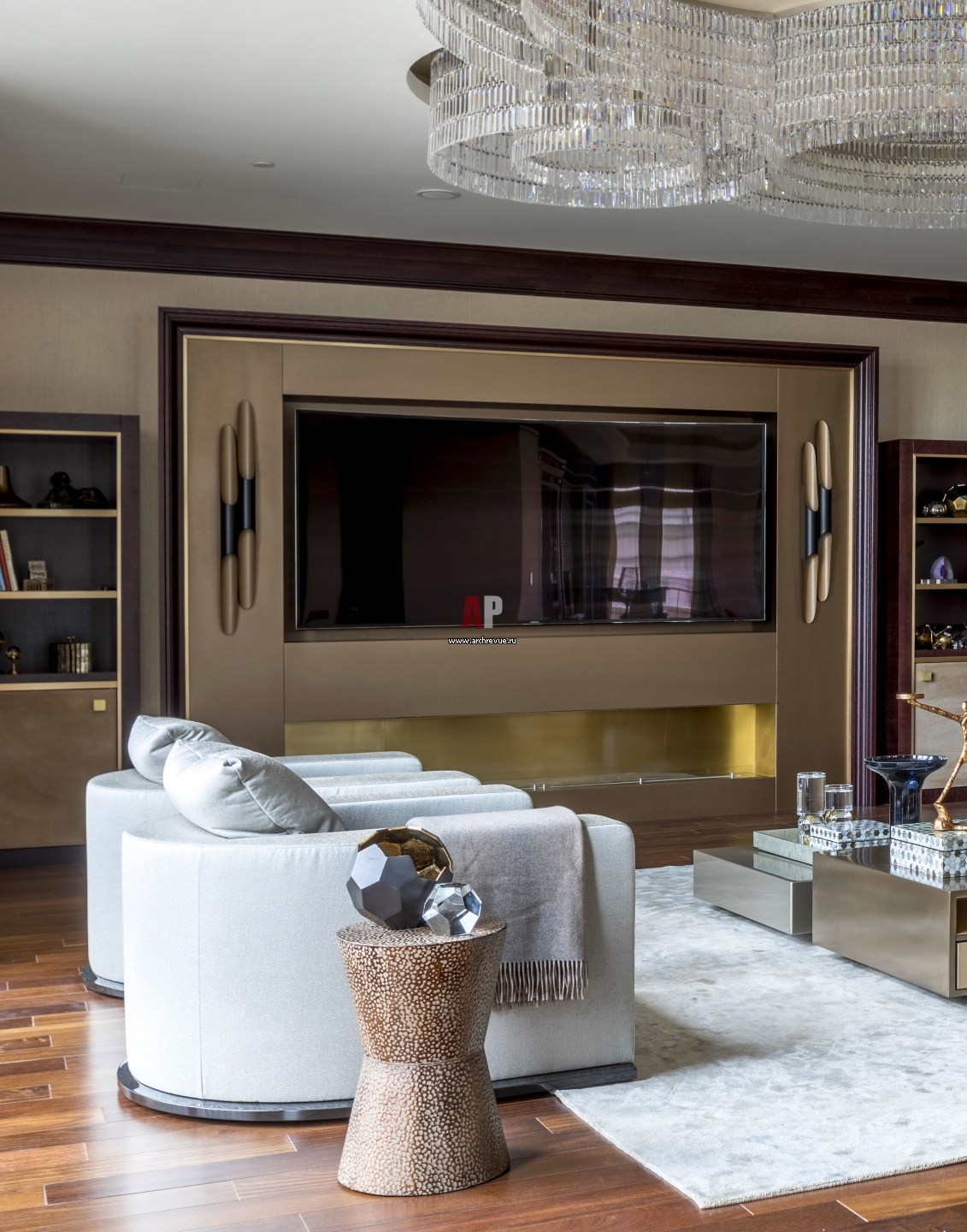 Зона ТВ со встроенным камином. Обрамление камина из металла перекликается с дизайном журнальных столиков Fendi с эффектом жидкого золота. Встроенные элементы выполнены на заказ по эскизам дизайнера.