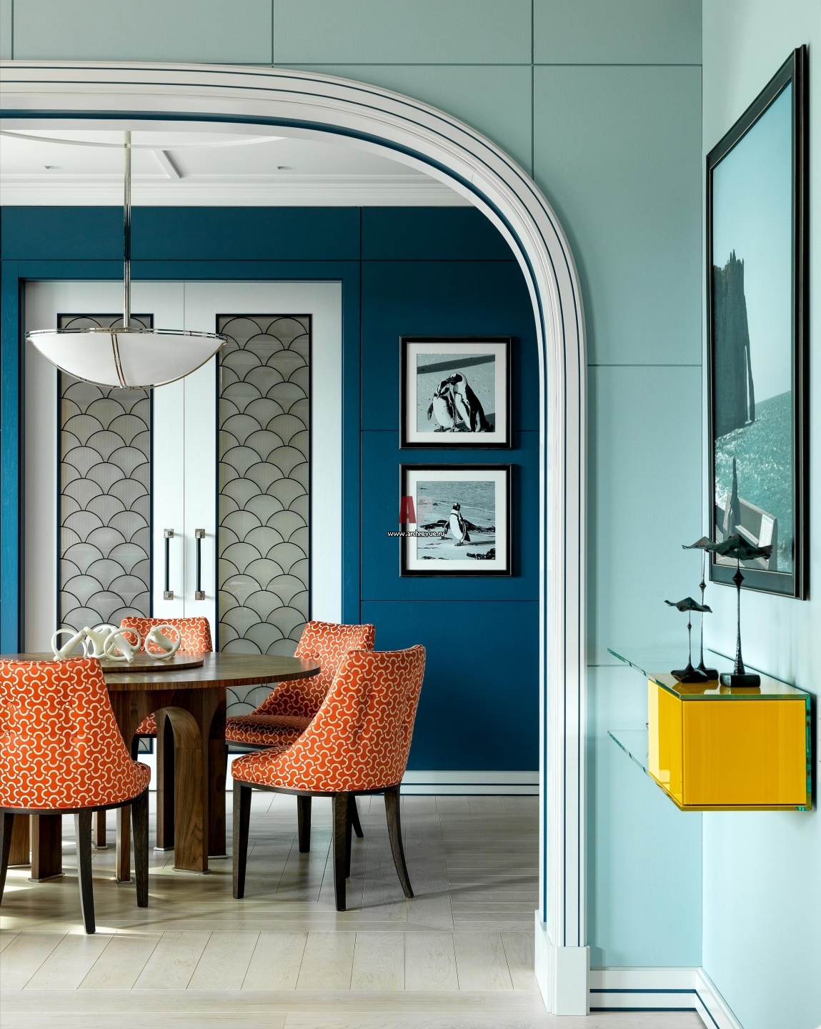 На полу жилых помещений – паркет из клена. Желтая подвесная консоль из стекла, Glas Italia. Тему арок поддерживает форма обеденного стола с круглой столешницей (диаметр 1,6м) и лепной декор потолка.