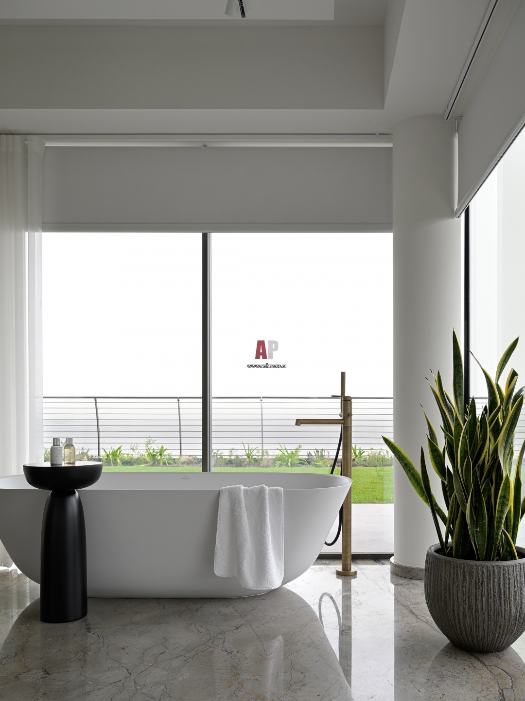 Итальянский минимализм. Двухэтажные апартаменты на озере Гарда. Хозяйская ванная комната с панорамными окнами.