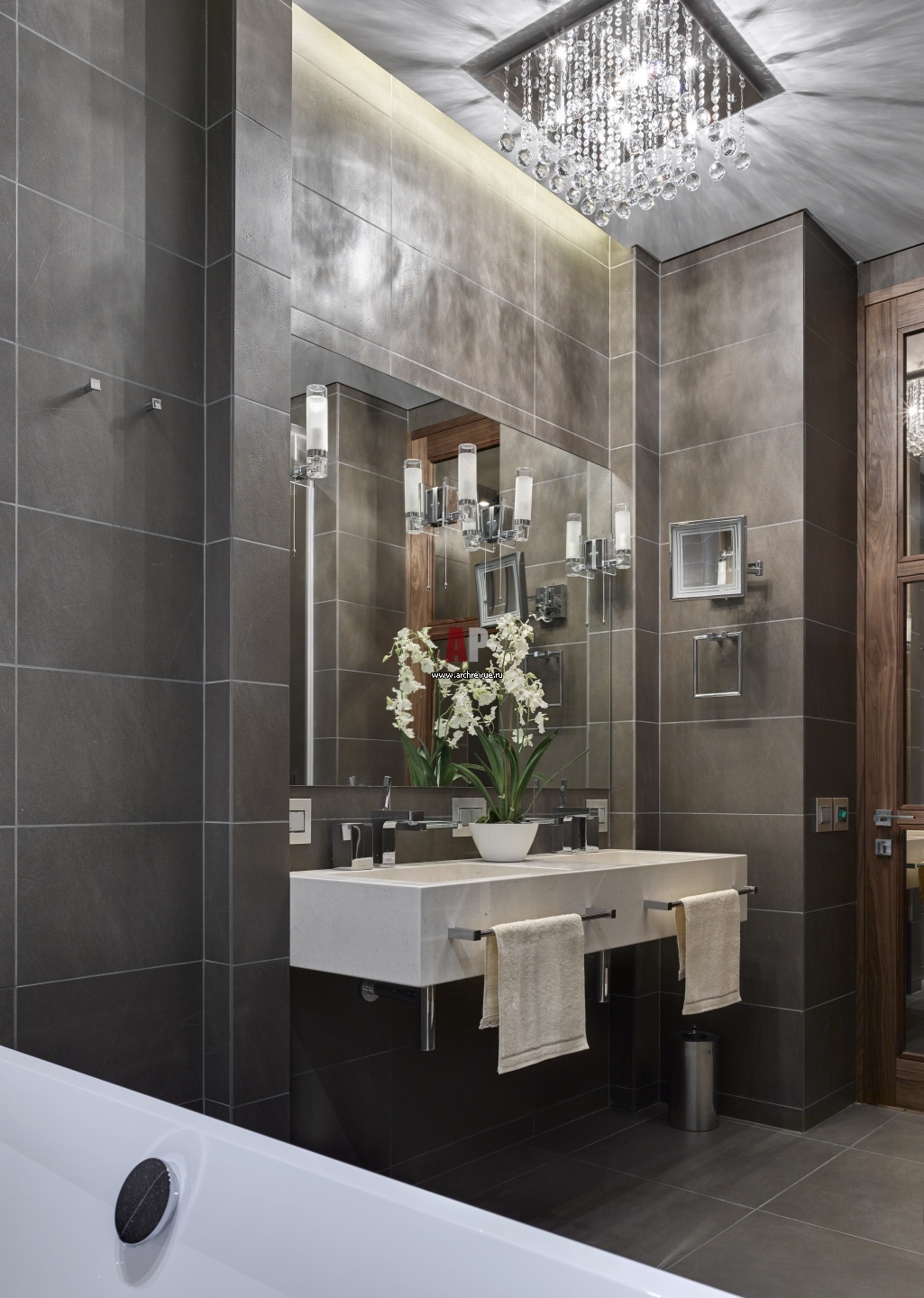 Праздничную атмосферу в лаконичном гостевом санузле создает потолочный светильник с ниспадающими хрустальными подвесками.