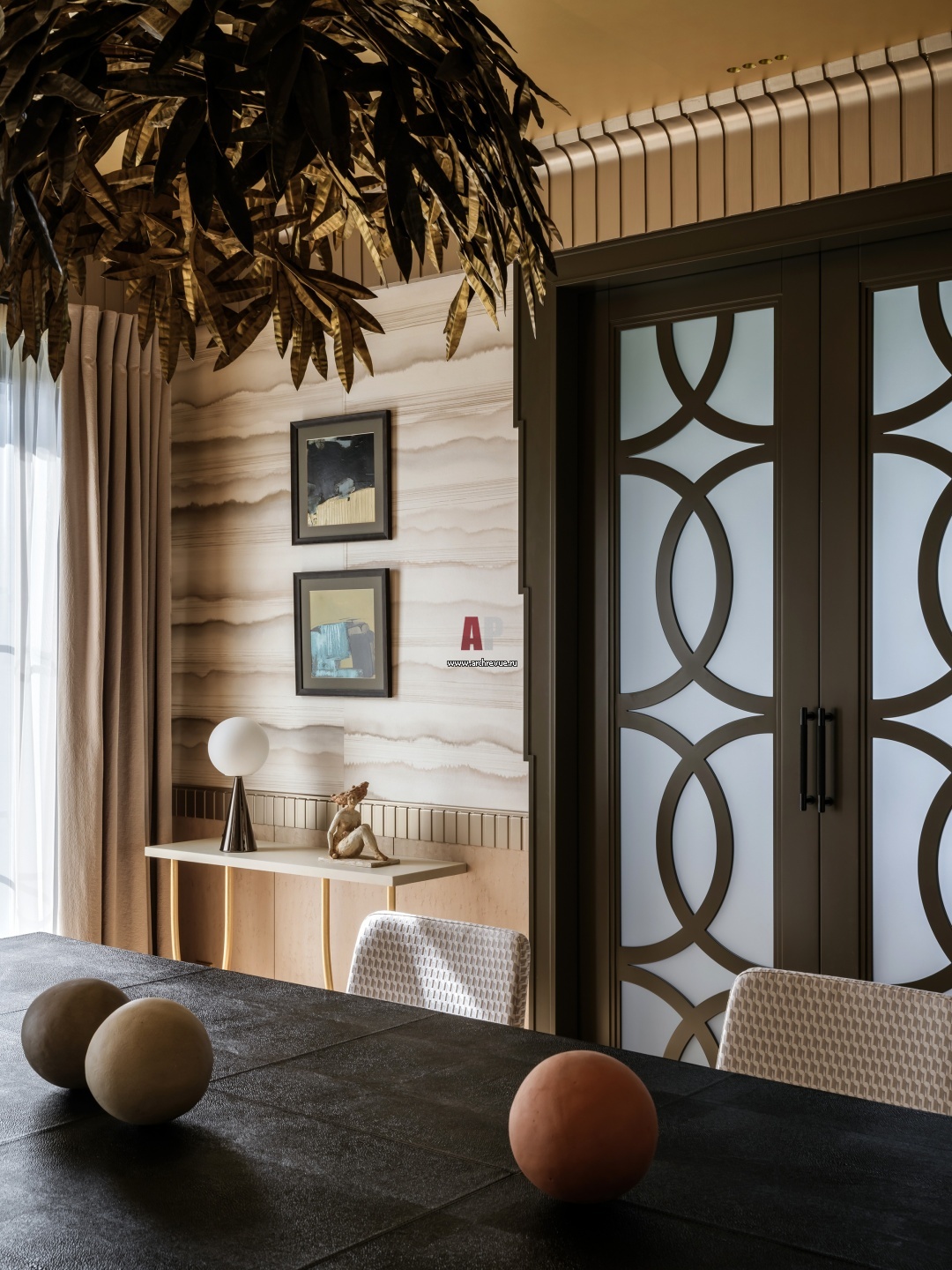 Столовая. Раздвижные двери с рисунком в стиле ар-деко отделяют кухню. Консоль, Porta Romana. На ней – светильник, FontanaArte.