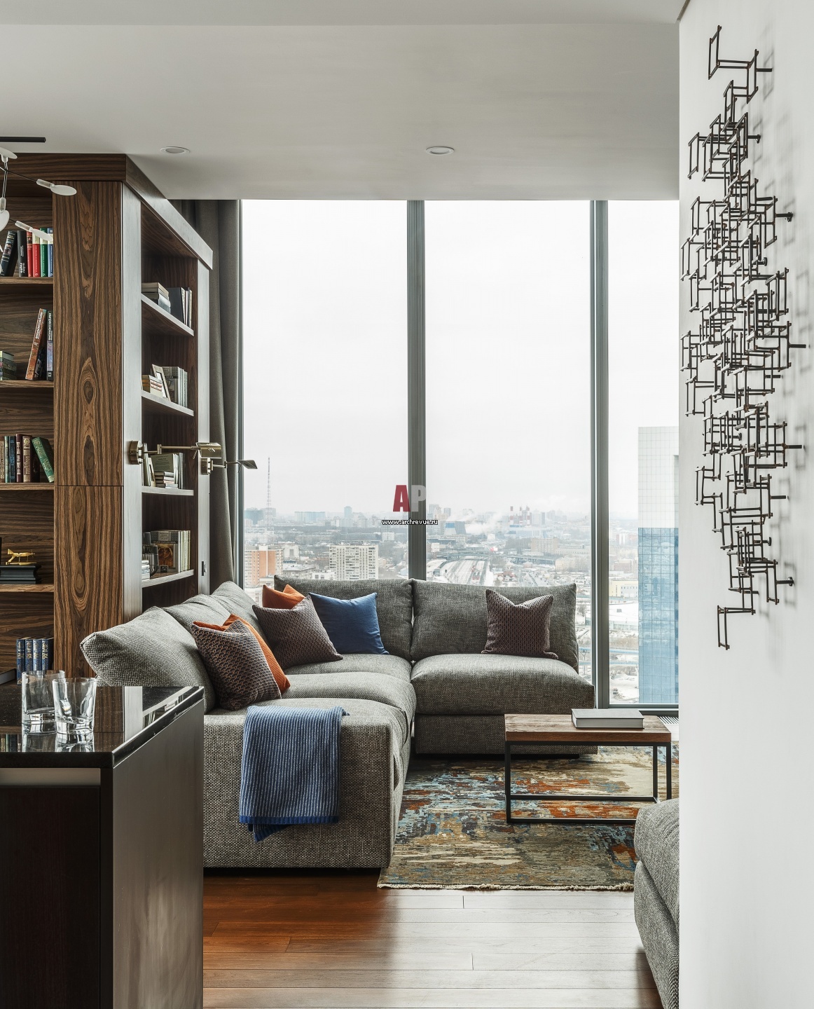 Интерьер гостиной. Металлическое панно на стене, поставщик Crate and Barrel.