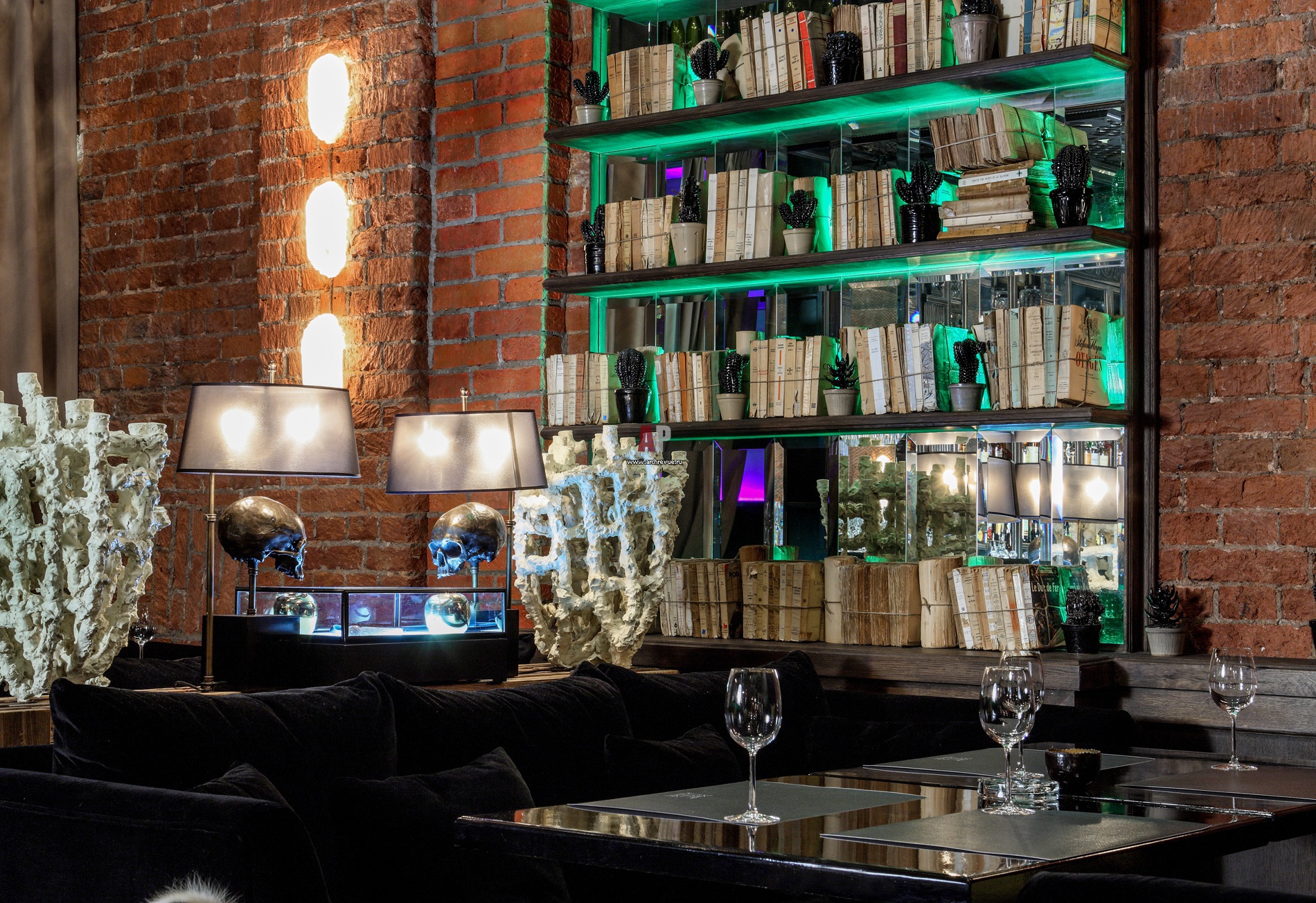 На фото – китчевый интерьер зала ресторана. В выложенной зеркальными плитками нише расположилась библиотека с букинистическими книгами на иностранных языках. Между ними – черные кактусы из пластика.