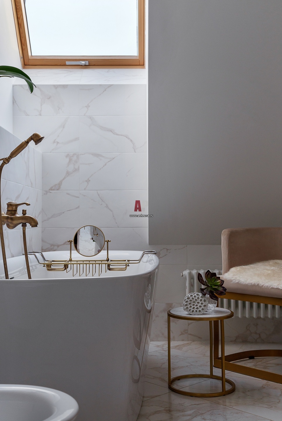 Спокойная квартира для творческой семьи. Интерьер ванной комнаты в мансарде.