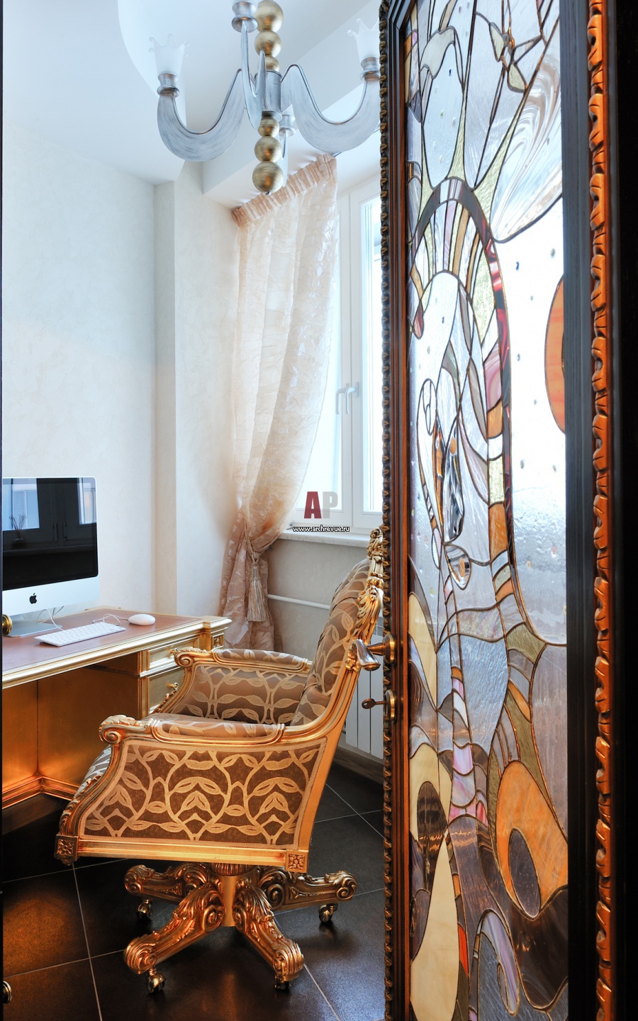 Кабинет площадью 5 кв. м расположен на присоединенном и утепленном балконе. Дверь украшена художественным витражом по эскизам Н. Акуновой работы Екатерины Ивановой-Остапенко.