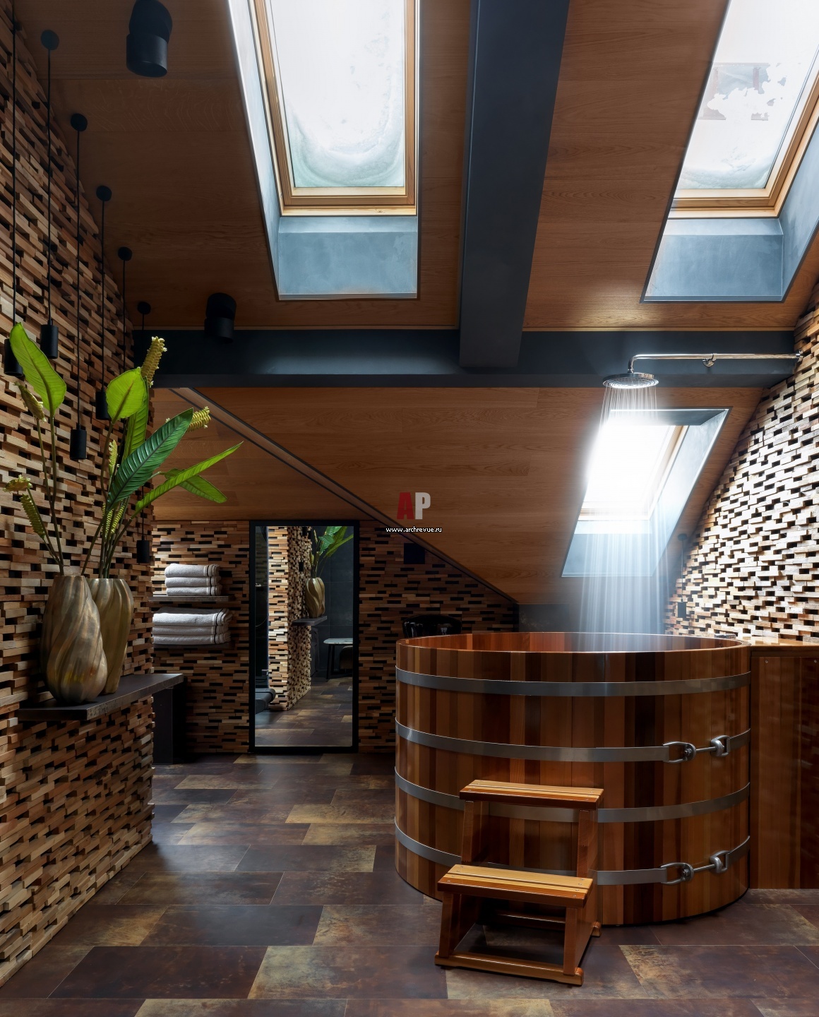 Зона СПА в мансарде. На полу – панели из кожи бизона. Мансардные окна, VELUX.