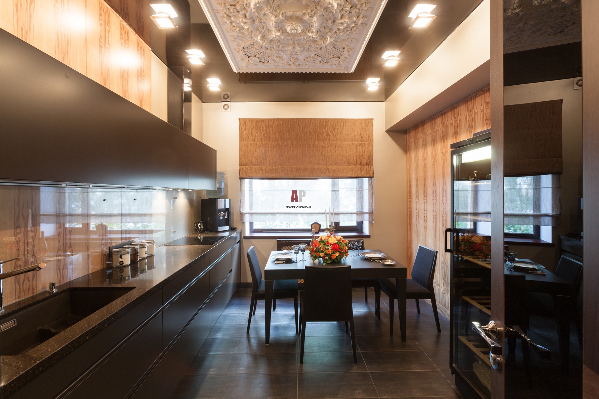 Интерьер кухни представительского офиса. Главное украшение помещения – красивое лепное панно на потолке. Трехметровое гипсовое панно сделано на заказ по эскизам декоратора. На стенах – панели из древесины американского ореха.