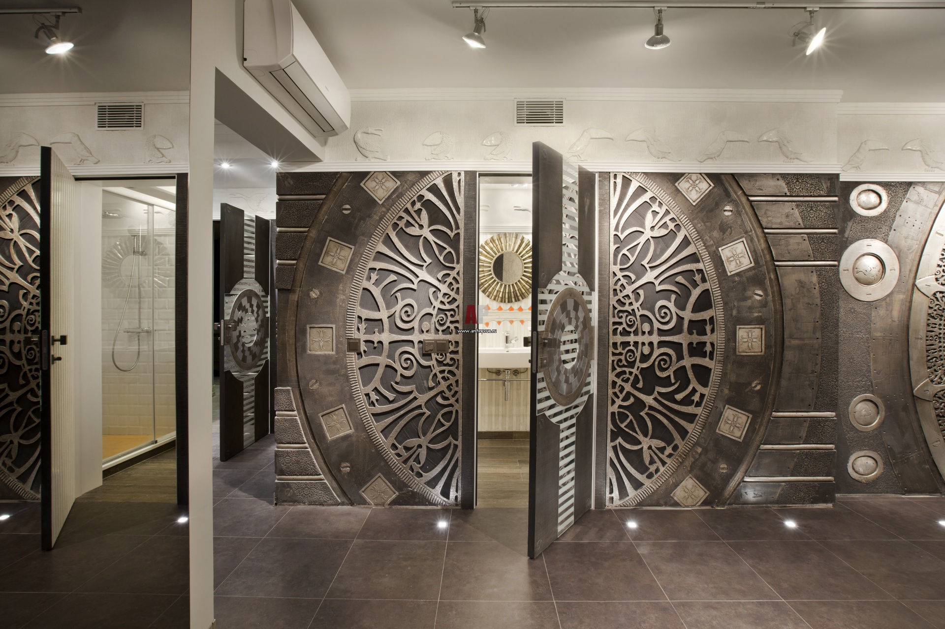 Интерьер тамбура SPA-комплекса выполнен в стиле стимпанк. Чтобы создать круглые двери и выразительные панно, художник сначала выполнил их эскизы в полную величину на бумаге, потом с помощью проектора перенес изображение на стены.