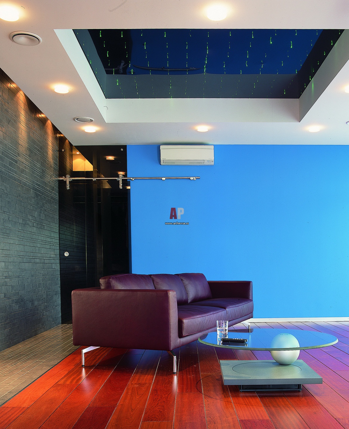Приватные апартаменты хозяев дома состоят из двух частей - спальни и мини-гостиной. Эти зоны контрастируют друг с другом по цветовой гамме. Если стены в спальне выкрашены в ярко-розовый цвет, то здесь они голубые. За дверью из тонированного стекла расположена гардеробная.