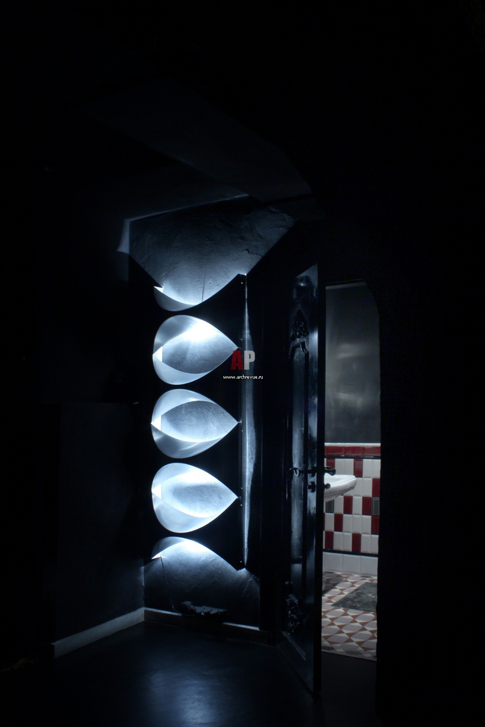 Вход в санузел освещает оригинальный металлический светильник с прорезями-лепестками. Светильник укреплен на стене и подсвечен изнутри.