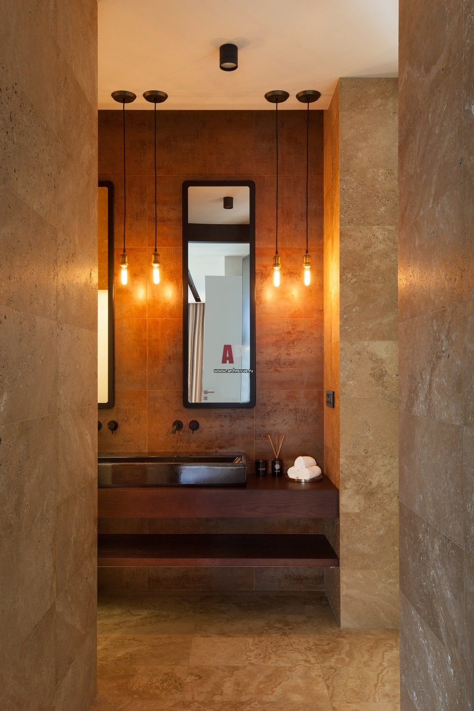 Интерьер ванной комнаты при СПА-зоне. Стены облицованы натуральным травертином. Подвесные тумбы, на заказ, по чертежам архитектора. Светильники, Centrsvet. Раковина накладная черная, Villeroy & Boch, серия Memento.