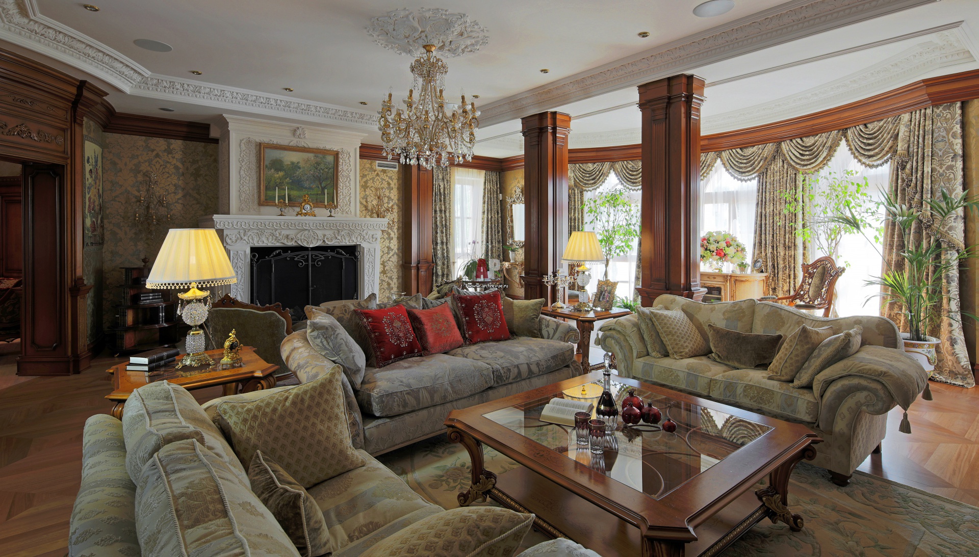 Центральный элемент гостиной – камин обрамлен порталом из резного камня, топка чугунная. Шелковые обои, Watts of Westminster. Вся мебель, свет, аксессуары, текстиль – поставщик Charles.Cameron.