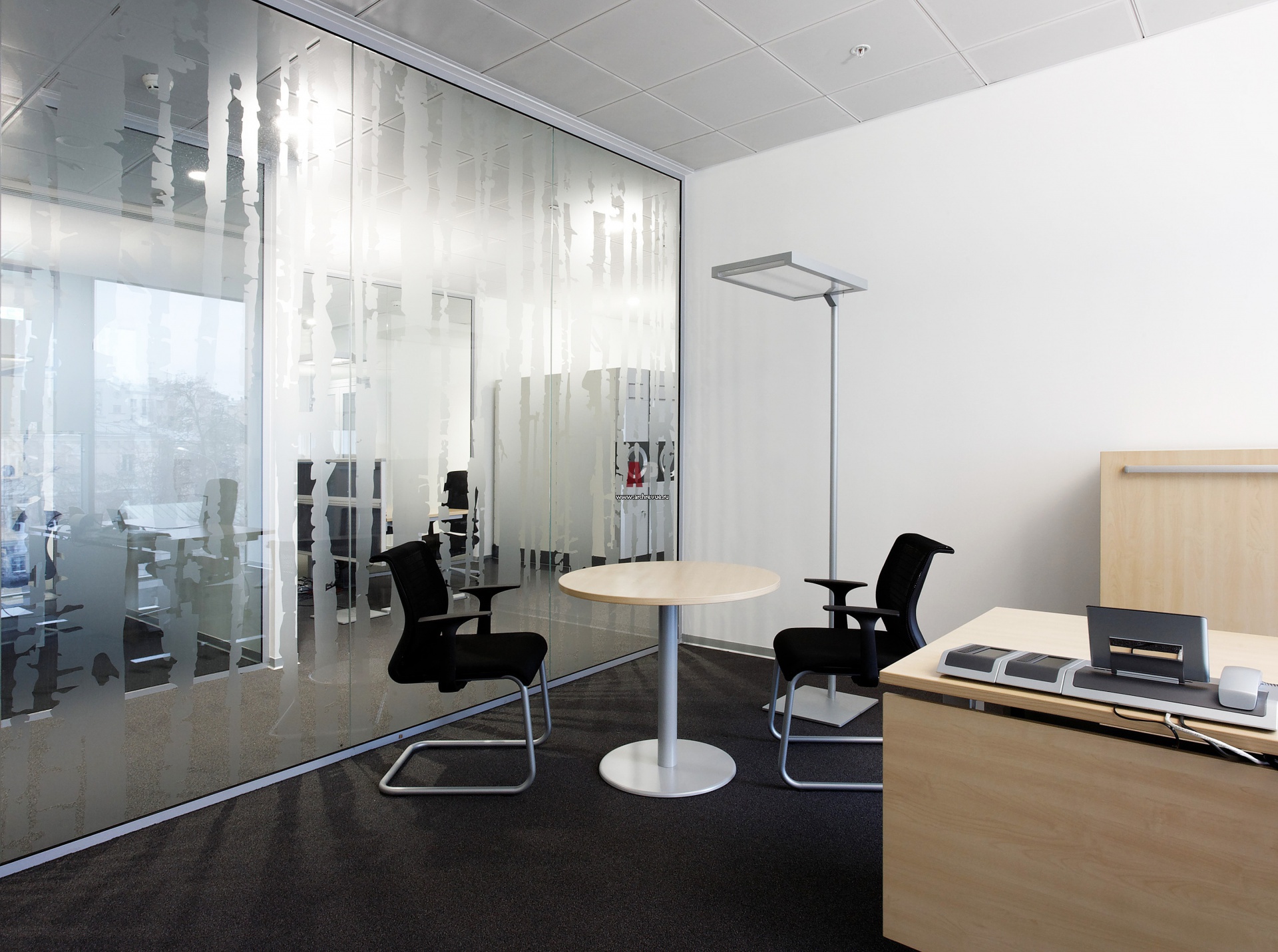 Национальный колорит в московском офисе международной компании передают стеклянные перегородки с изображением березок. Матирование в виде березок выполнено на прозрачном стекле.