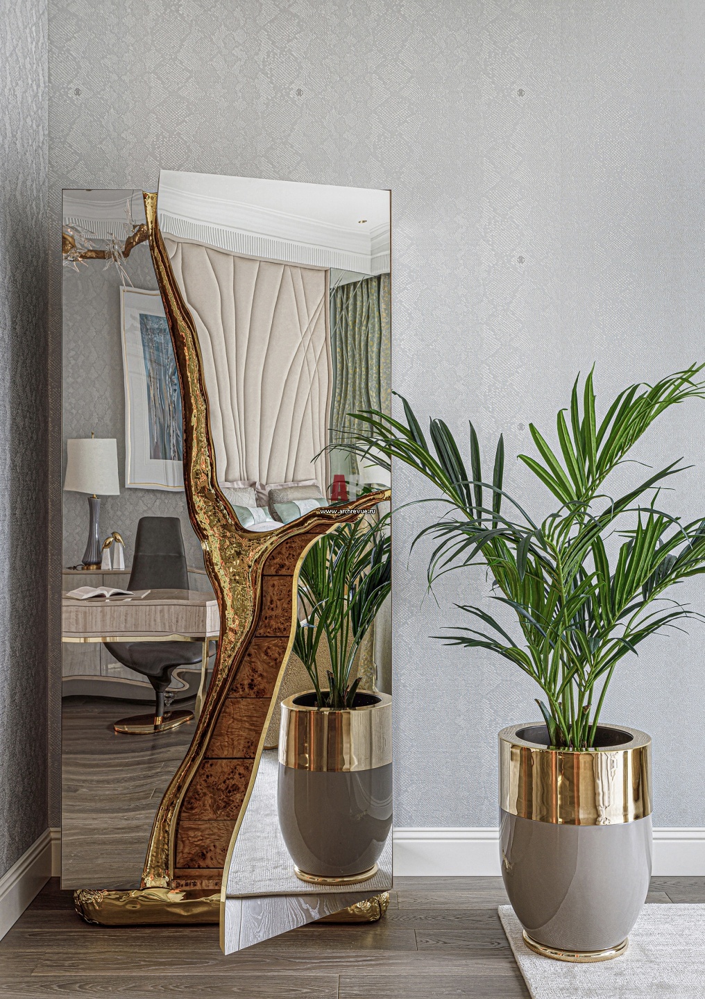 Эпатажный акцент женской спальни – шкаф Boca do Lobo. Он выполнен из металлических зеркальных листов, которые пересекает золотой ствол дерева.