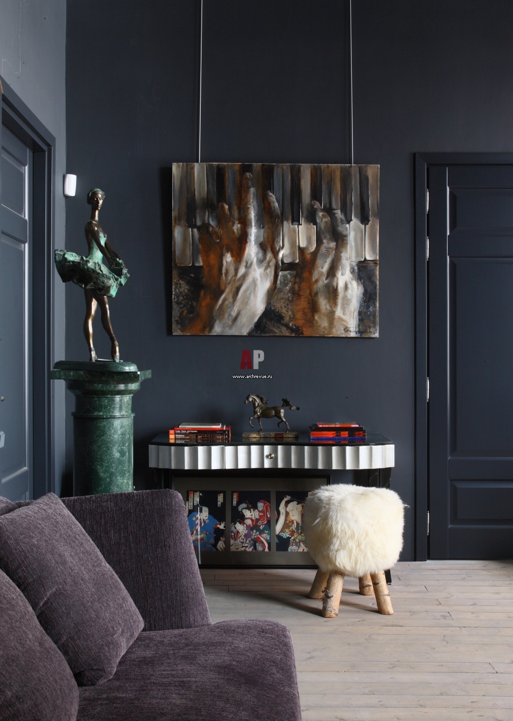 С темно-серыми стенами контрастирует дощатый пол, покрытый маслом светло-серого цвета. Японские гравюры укиё-э XVIII-XIX века, вазы Eichholtz и антикварные издания по истории искусств из личной коллекции Марины Брагинской.