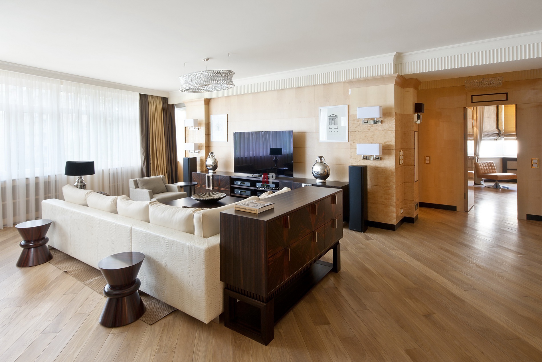 Корпусная мебель в доме, в том числе комод в стиле ар-деко из палисандра сделан на заказ по эскизам архитектора, изготовление «Столмастер». Рисунок шпона фасадов комода набран в виде звезды.