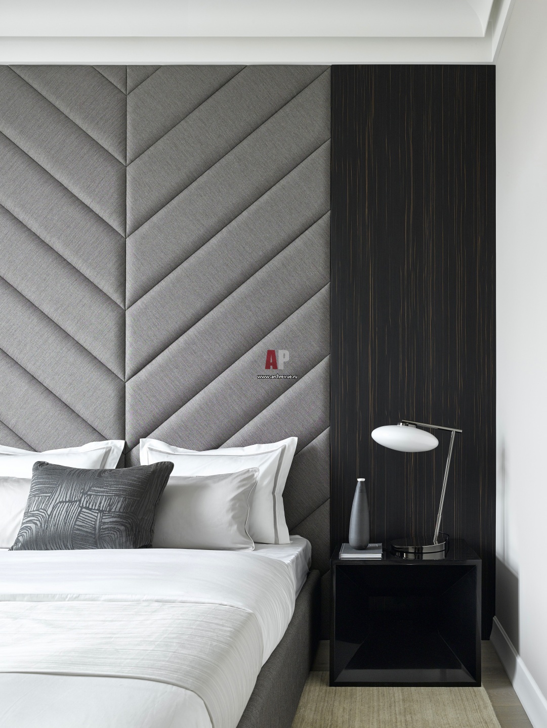 Трехкомнатная квартира в новостройке в историческом центре Москвы для сдачи в наем. Интерьер спальни. Кровать и прикроватные тумбочки сделаны на заказ. Вазы, Savour Design.
