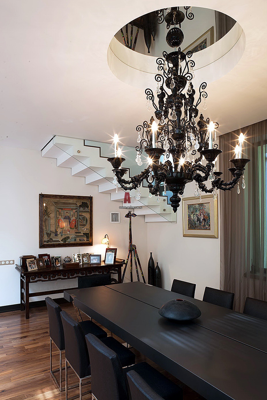 Столовая зона выделена круглым натяжным потолком с неоклассической люстрой из черного стекла от Barovier & Toso. Один пролет лаконичной лестницы со стеклянным ограждением вынесен в пространство гостиной.