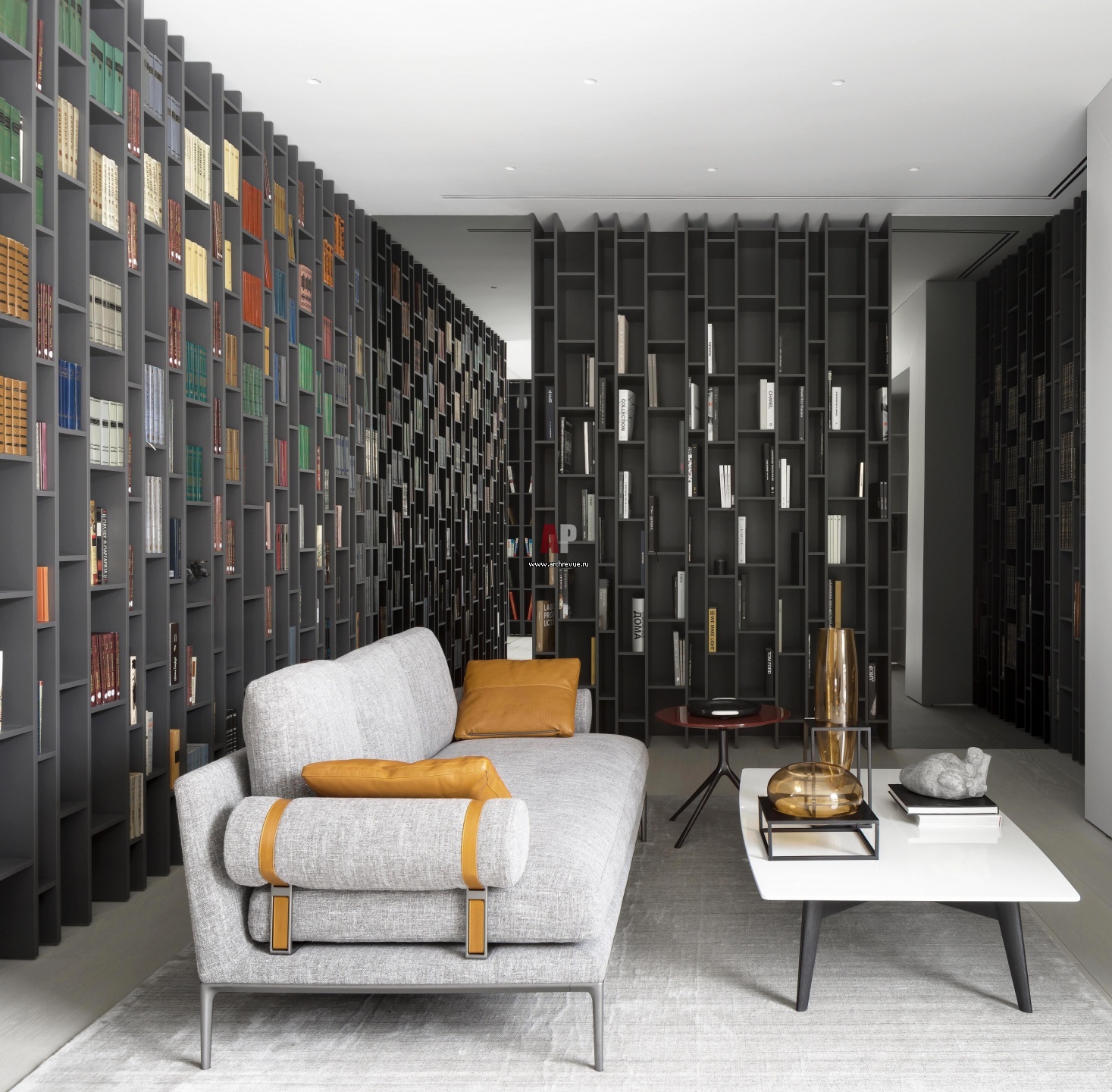 Интерьер библиотеки в современном доме. Книжные стеллажи от пола до потолка задают ритм и масштабируют пространство. Зеркальная панель раздвигает границы помещения.