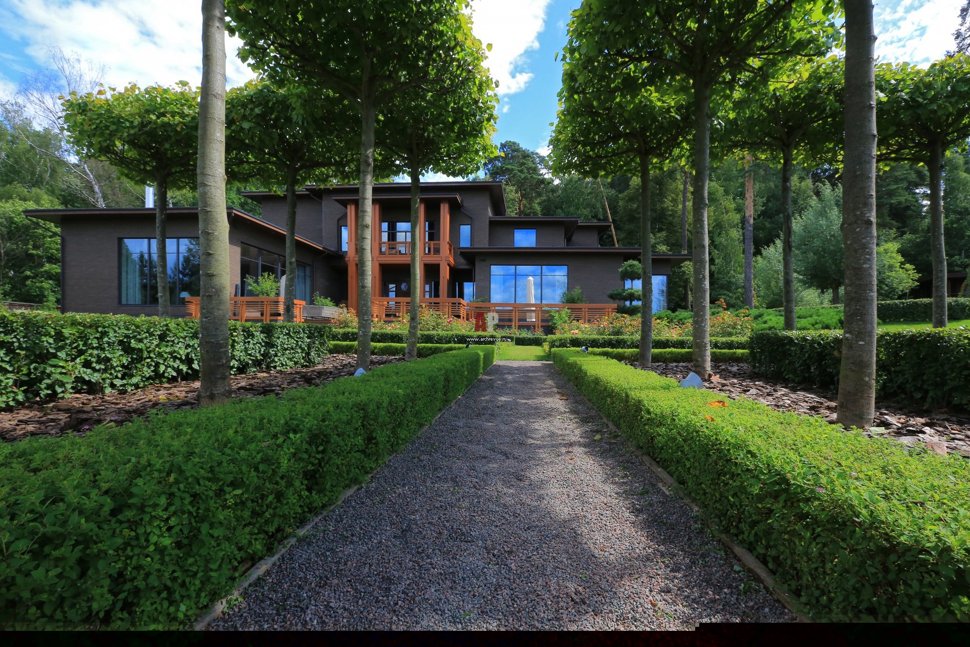 Высаженные правильными прямоугольниками липы образуют парадные аллеи, которые ведут к входной группе дома. Дорожки выложены каменной крошкой, посадки оформлены обсыпкой из древесной коры.