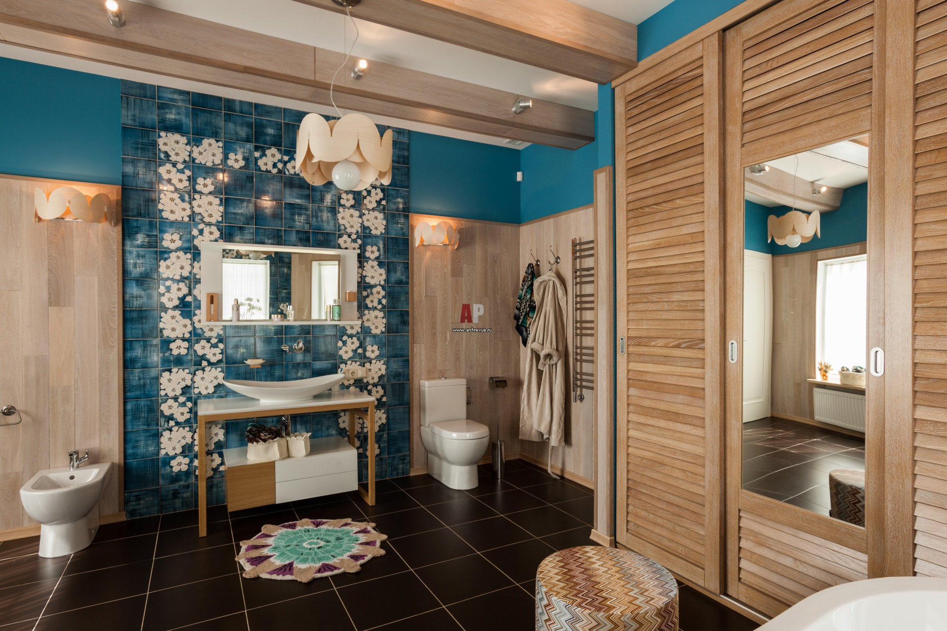 Интерьер ванной комнаты в отделке светлым деревом и керамической плиткой синего цвета. Сантехника,Villeroy & Boch.