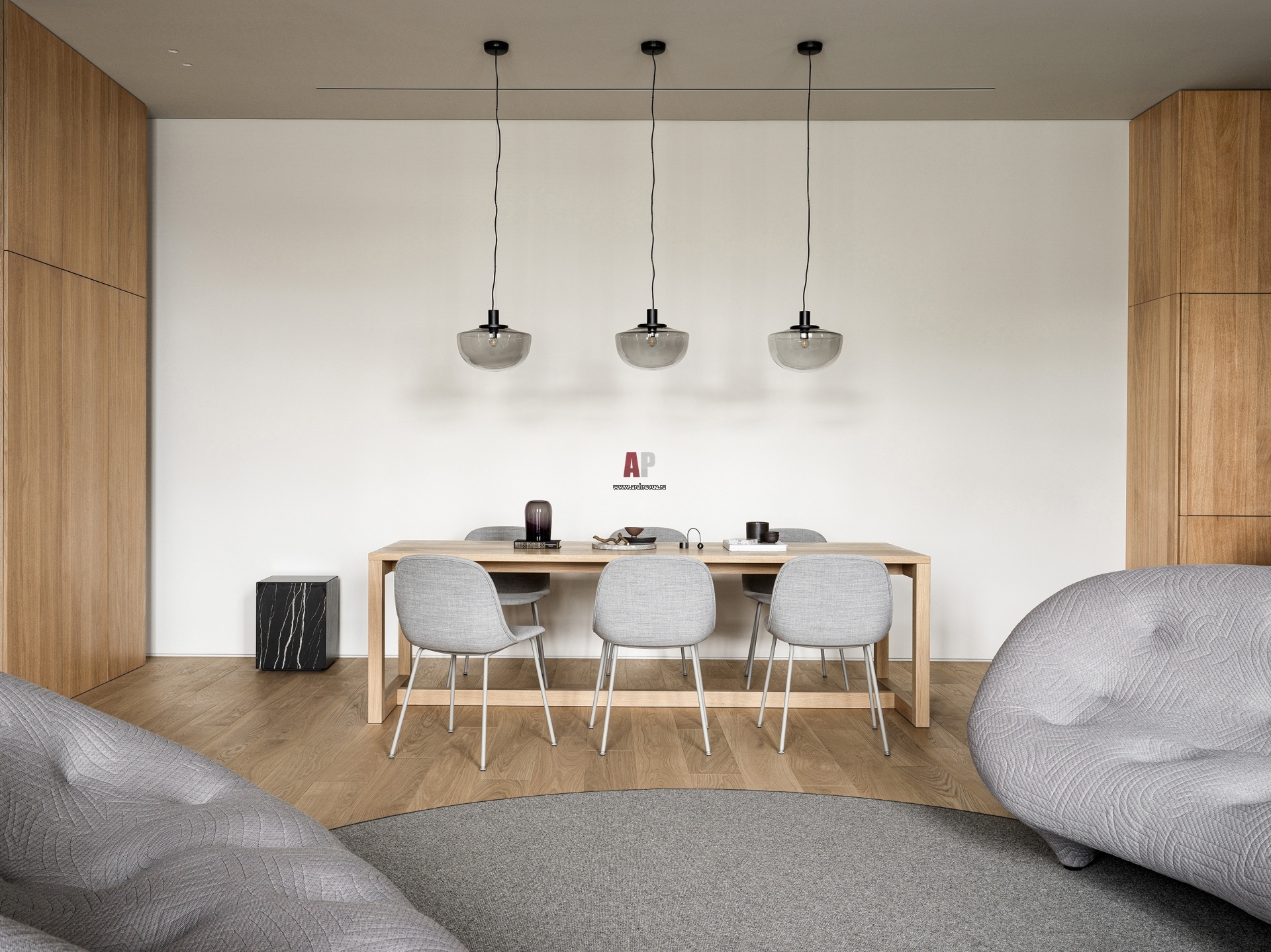 Столовая. Обеденный стол изготовлен на заказ по индивидуальным эскизам авторов проекта. Стулья, Muuto. Подвесные светильники, Audo Copenhagen.