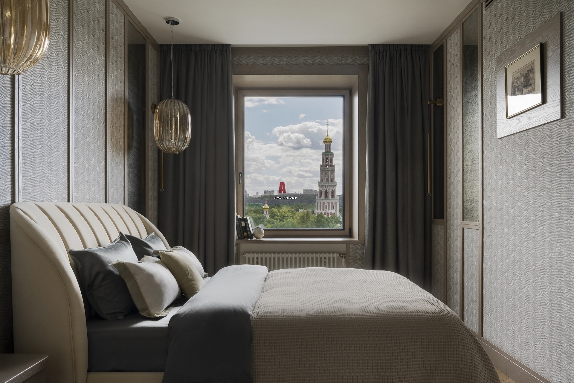 Главный декоративный акцент спальни тот же, что и гостиной – вид из окна на Новодевичий монастырь. Стены декорированы плотными тканями с геометрическим рисунком.