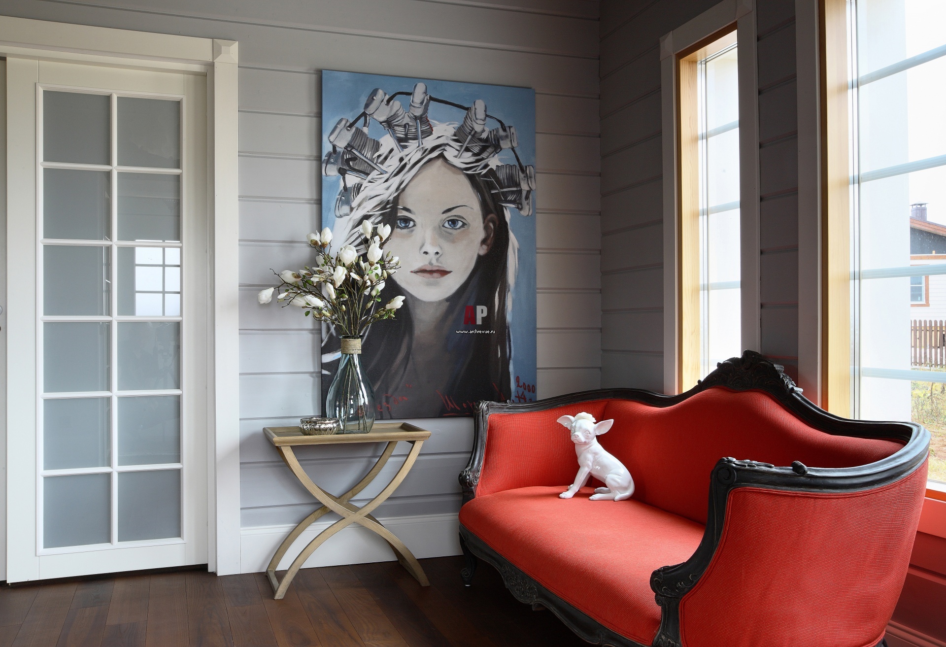 Интерьер прихожей. Белые раздвижные двери сделаны на заказ. Красный диван, WonderWood. Живописное плотно «Звезда» работы Дмитрия Шорина.
