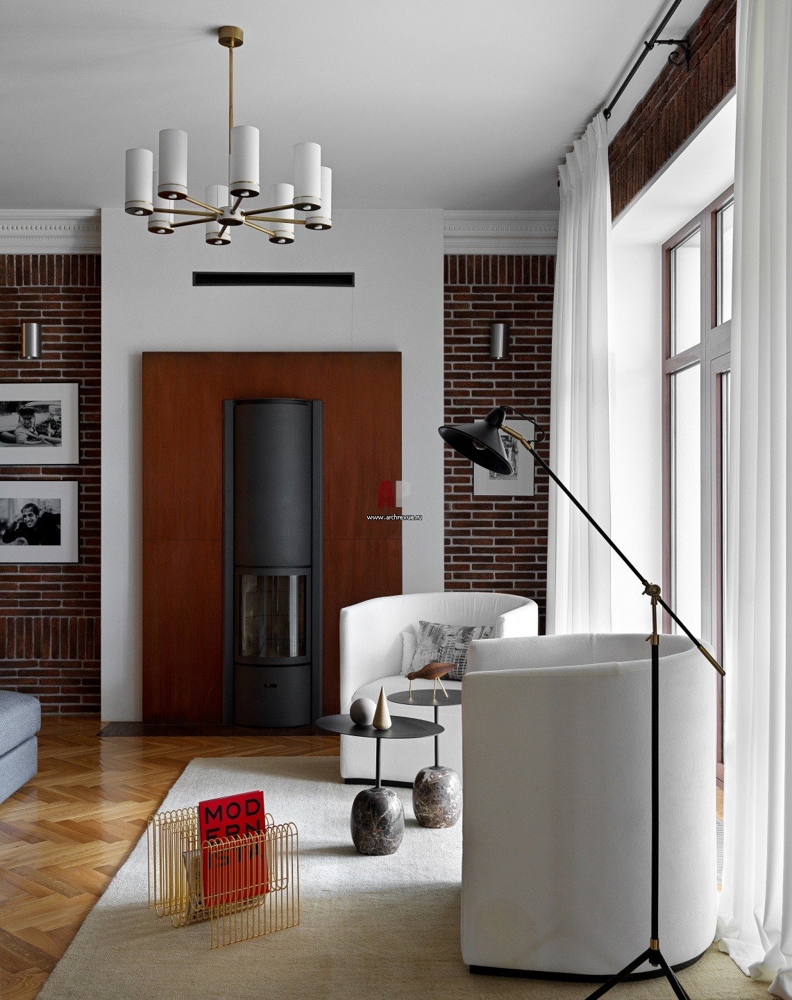 Каминная группа в гостиной выглядит сдержанно и брутально за счет использования металла и камня в отделке портала.