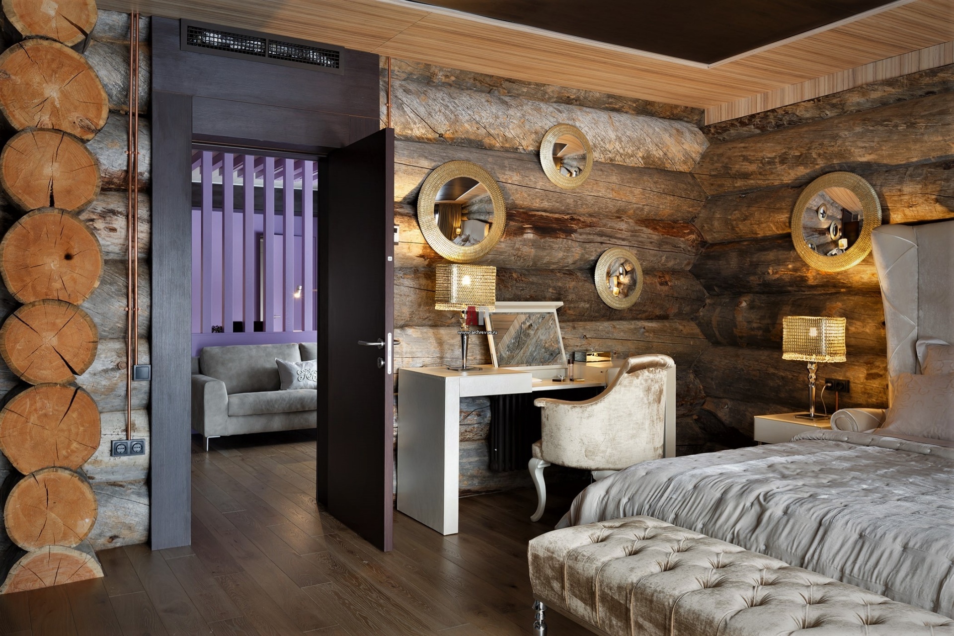 Второй этаж – полностью хозяйская территория, она включает два равнозначных жилых объема: женский и мужской. Каждый со своей спальней, ванной комнатой, гардеробной и кабинетом.