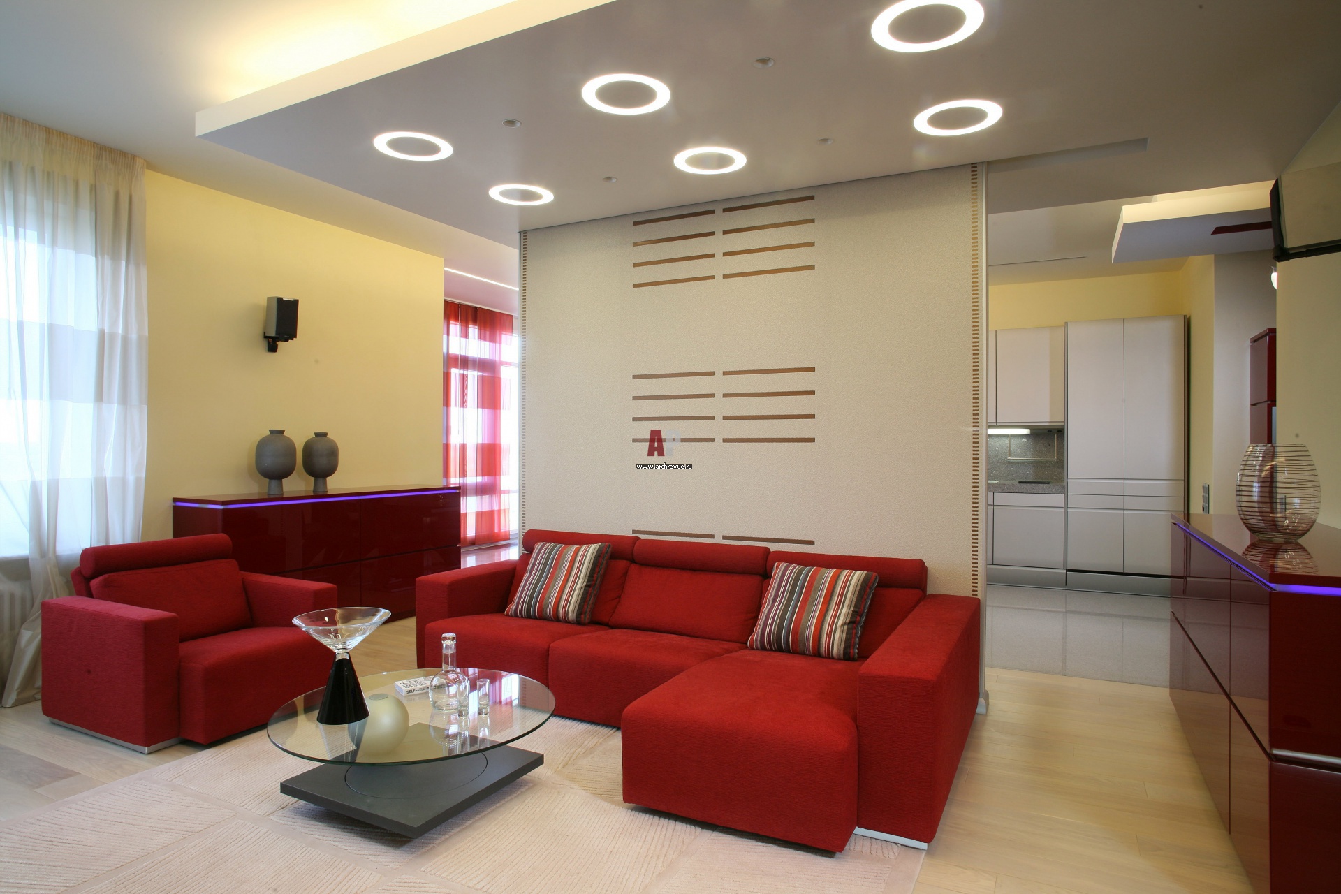 В интерьере гостиной прямоугольные формы смягчают светильники-тарелки от Modular. Они встроены в разноуровневый навесной потолок, выделяющий зону гостиной.