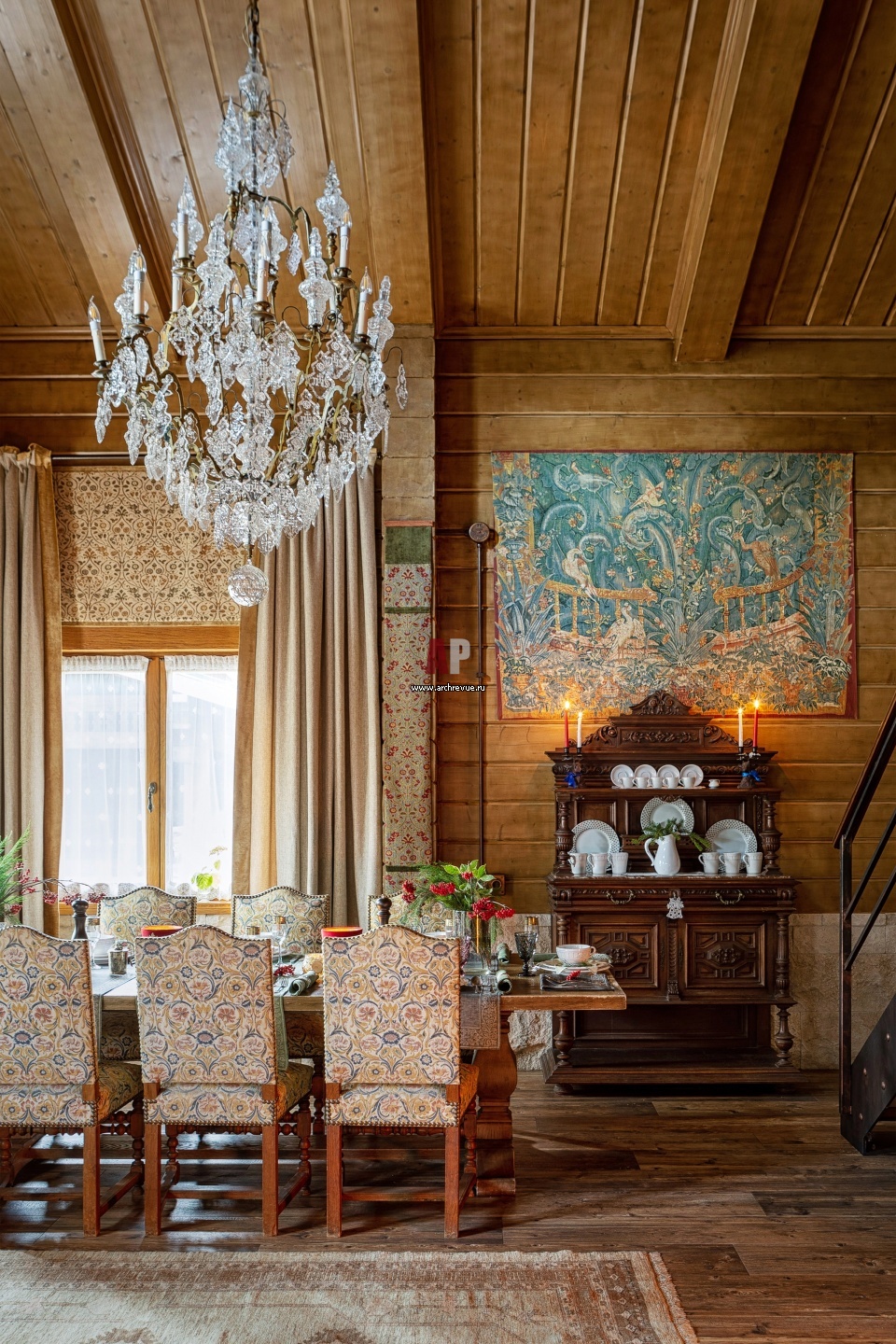 Главным украшением дома стала люстра, купленная на антикварном рынке во Франции. Текстиль для штор и ламбрекенов Jim Dickens подбирали специально под антикварные стулья.